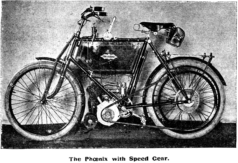 PHOENIX MOTORS, BLUNDELL Street, Caledonian Road, London, N, show their two-speed gear in working model form. As is well known, the Crypto system of cog-wheels always in mesh is employed to secure a low gear for starting purposes or for hill climbing. The power can be let in very sweetly, because a leather-faced clutch is employed, and thus there is an entire absence of shock in starting. Nor can the clutch be let in sharply and so cause jar or shock. By means of a short lever carried on a quadrant on the top tube of the frame, operating through cable wire, the clutch can be thrown out and a free engine obtained. Then a further movement of the lever Locks, by means of face dogs, the two parts of the gear together, and a high gear for level roads and moderate gradients is secured.”