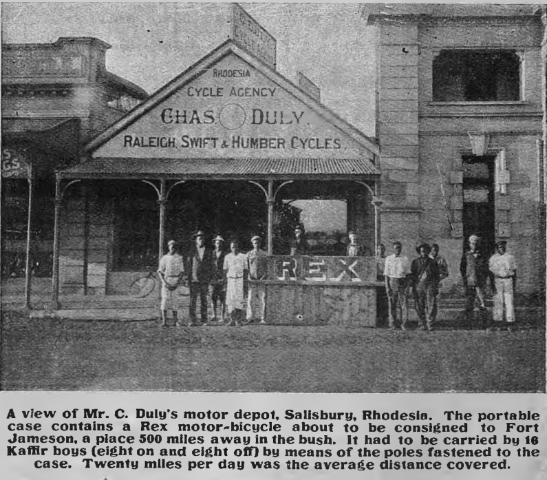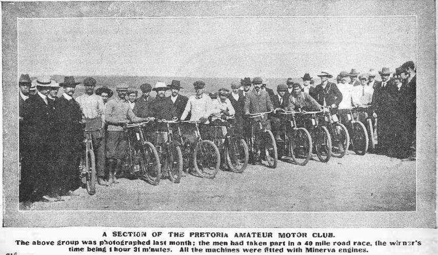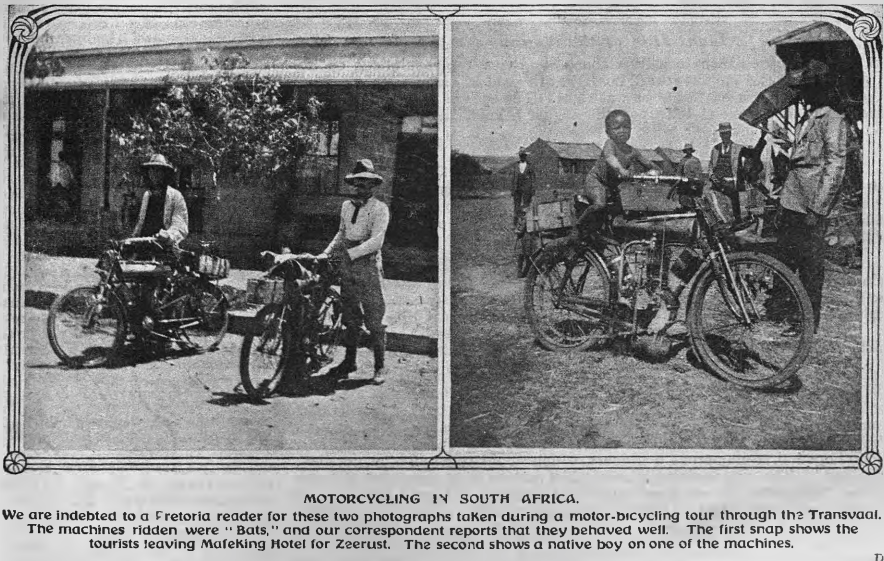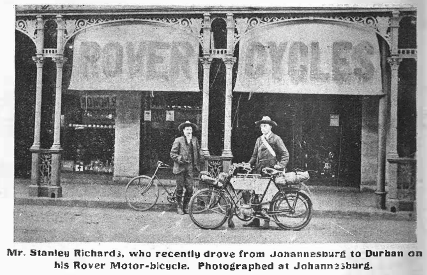 “MOTORCYCLING IN SOUTH AFRICA. A Johannesburg correspondent sends us a few interesting details about the annual motor-bicycle race from Johannesburg to Pretoria and back for the ‘Gordon Stuart Cup’, which was run off last September. The cup has to be won three times before it becomes the property of the winner, and the winner of each year receives a gold medal. This year’s race was won by R Murkett, who beat the record by eight minutes on a 2¾hp Royal Shimwell Bros, motor. His full time was 3hr 10min 45sec. The second man in (Chater) rode a similar machine; and the third man (Halscomb) was on a 3hp Rover. Considering the terrible roads, and the fact that two small rivers had to be crossed each way, the race was a fine test of reliability both of machine and man. Mr Murkett is well known in cycling circles at home, and was employed a few years back at the Rover Company’s repairing depot in Holborn. He is a novice at motor racing. The English reader can form no idea of South African roads unless he has been out. In some parts there is sand a foot deep and stones galore. A couple, of the competitors were thrown off their machines. At one part of the journey there is a steep hill, and at the bottom is a small river. One of the riders got stuck in this and took five minutes to get out of it.”