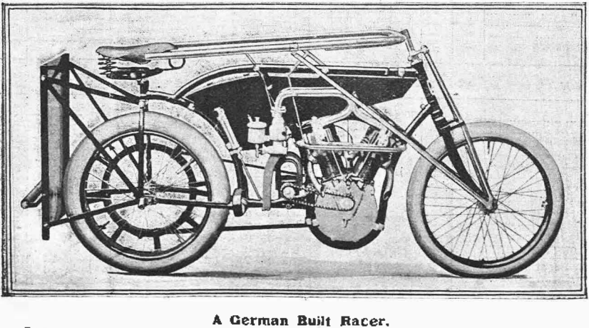 “A MACHINE WHICH can easily touch a speed of 95 kilometres per hour (60 miles approximately) is that depicted in the illustration. The makers are Messrs Laurin, and Klement, a well-known German firm, reputed for racing machines. The engine is a twin cylinder type of 12hp, driving by a V belt. The ignition is of the Eisemann high-tension magneto type, the dynamo being driven by a chain from the motor. The carburetter is a spray type. At the rear of the machine will be seen a wind screen and safety roller to be used when the machine is employed for pacing a racing bicyclist. The control levers are mounted on the curved top tube of the frame. There are no pedals, but a sort of stirrup rest is provided for the driver’s feet.”