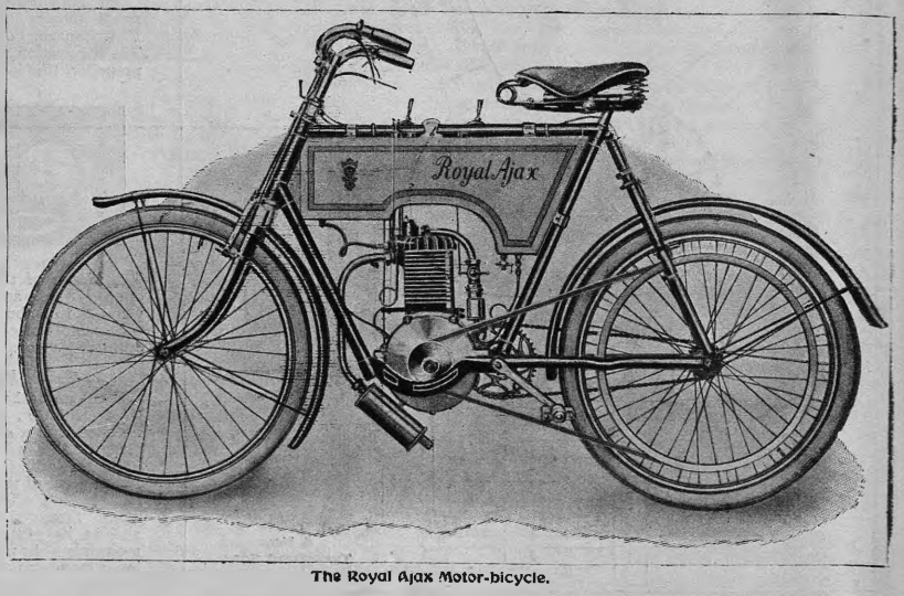 “THE AJAX MOTOR-BICYCLE. The Royal Ajax motor-bicycle has recently been introduced by the Silver Queen Cycle Co, 18, Gray’s Inn Road, WC. The engine is 2¾hp with automatic inlet valve, the gas being supplied from an English spray carburetter with throttle. The petrol tank has a neat pointer indicating quantity, and will hold petrol sufficient for 160 miles. Space for lubricating oil is included in tank, and a flap-fronted compartment for two accumulators and coil. Ignition is by high-speed trembler coil and wipe contact. A special form of triple head, a large motorcycle free-wheel clutch, a stand and carrier, with portion of back mudguard attached for convenience of puncture repair are features of the machine. V-belt, efficient brakes and Clincher tyres complete the specification. The price, 38 guineas net cash, includes carriage and the various fitments mentioned above.”