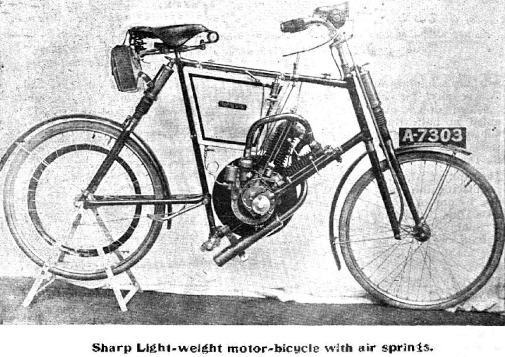 “SIR,—I BEG TO send you a photograph of a spring frame for motor-bicycles, which I consider very essential from the point of view both of ease of running and greatly lessened vibration. On examination it will be seen that a short length of tubing is fixed in front of the steering head or stem, giving the bicycle somewhat the appearance of having two heads. In this extension a tubular prolongation of the fork crown is allowed to work up and down with a piston or telescopic action; its movements in either direction being checked by means of buffer springs. To allow of the staying of the lower ends of the front fork tubes these latter are attached by means of two hinged tubular stays to the lower end of a member or support made of two lengths of D-tubing, these being affixed to a lug on the lower end of the steering pillar. The two D-tubes in question are built apart to allow of the steel mudguard being fitted. It will also be seen that a similar telescopic movement is arranged for the back fork, the chain stays being hinged near the bottom bracket. It will be noticed from the illustration that there are very few working joints, and these have been so arranged as to reduce the movement to a minimum. The frame and fork can also be used as a rigid machine at will. I might mention that during the tests through which the bicycle has been put it has been fitted with ordinary Clipper 1¾in cycle tyres. I have so arranged my invention that every part of the fork, etc is a strengthening part or support for the other, and the experimental machine is built up of light gauge material. Therefore, I claim that it can be ridden with every confidence; and even if it should happen that the springs give way, which is not at all likely, the rider can still continue his journey safely, as though on a rigid frame. The advantage of a spring frame and fork for motor-bicycles is that it can be ridden during the winter months fitted with solid tyres, thus preventing any fear of skidding, or side-slip; and I am convinced it would give every satisfaction, as I have allowed of a vertical movement of an inch and a half. The frame is suspended between springs, these being fixed at the extreme ends, thereby avoiding any vibration at the handlebar, saddle and pedals. It is also perfectly rigid laterally. For light engines up to 2hp I have a design slightly different from the one mentioned above. In this the front fork telescopes in the steering stem, which gives the bicycle the appearance of an ordinary bicycle and this class of fork is also adaptable to ordinary pedal propelled cycles. The frames can be built for either position of engines, vertical or inclined, as desired. The cycle illustrated has been in daily use for the past six months and during that time it has been ridden by experts and has given entire satisfaction.