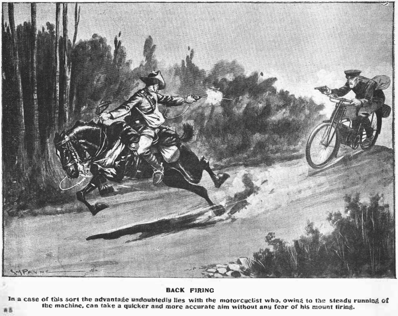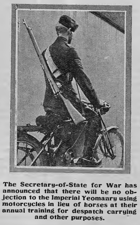 “MUCH IS BEING written and spoken just now on the question of the horse vs the motorcycle, and the matter of substituting a motor cycle corps to perform some of the functions of cavalry is being discussed in all its bearings.”