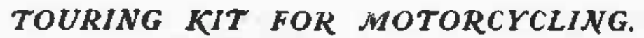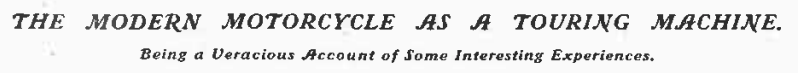 “THERE ARE NOW, I suppose, 25,000 motorcyclists in the kingdom. These figures astonish the trade, who, 12 months ago, scoffed at an estimate of 18,000; they astonish the Income-tax Commissioners, who wonder how we can afford it; while we, who have tasted the joys of the sport, marvel that every well-to-do artisan does not forswear beer and tobacco to buy a machine. That there are no more is not because of impecuniosity. Just stand outside a garage in some popular holiday resort and watch the touring motorcyclist arrive. It is pouring with rain, and the streets are smeared with mud—red, black, yellow, white, or brown. So is the dismal figure whose approach is heralded by a series of spasmodic, intermittent bangs. He dismounts wearily, directs the attendant to repair his leaky tyres, trace a recurring ‘short’, drain the water from his carburetter, and replace sundry lost screws and nuts. He gazes sadly at his soaked and streaky suit of tweed, his limp, spongy collar. He then sneaks sadly off to a remote hotel, where disreputable habitués stare insultingly at him. He either removes his sodden attire, and goes remorsefully to bed, or he sulks about the lounge and smoking-room with leaden feet, catches cold, and dreams of home—clean shirt, comfortable flannels, woolly pyjamas, and an easier to-morrow. He is a terrible warning to the local nibbler who yesterday wrote to Coventry for a catalogue. In touring there are two things to aim at—comfort on the road and comfort at your stopping-places. To ensure comfort on the road you must first of all have a good machine, and know a little about it. These essentials secured, you will keep to your programme, unless your tyres puncture, your carburetter gets water-logged, or your ignition rained out. Considering that few motorcyclists cover more than 5,000 miles per annum, one would expect to see puncture-proof bands fitted to more machines. The first cost is certainly high, but from four to five thousand miles’ running can be obtained from a pair, if the back cover be put on the front wheel after 2,000; while the entire absence of puncture and side-slip are alone worth the money. I have not had a puncture for four months, except on a borrowed machine, without armoured treads. Water in the carburetter is a common nuisance on tour: it is very awkward to remedy unless a cow-shed is adjacent,