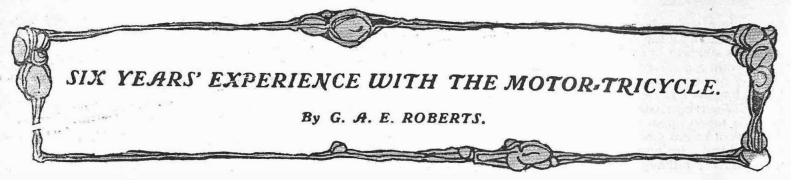 “MY EXPERIENCES DURING six years of motor-tricycling may perhaps be of some interest to others. I have ridden thirty thousand miles in all sorts of weather, and I think I have come across most of the little faults which a tricycle has. My first machine was a 1¼hp Beeston with tube ignition and surface carburetter. This was not powerful enough and I soon exchanged it for a 2hp of the same make. Tube ignition was very simple, but it involved the bother of lighting up, the nuisance of nipples getting choked, and the danger of fire, so that I do not think we shall ever see it adopted again for tricycles. With reference to fire, I had one nasty experience. Owing to a back fire the carburetter burst and caught fire, the burning petrol covering my clothes. This was very alarming at the time and although I was not burnt myself, owing to a thick ulster which I was wearing, the machine was very much damaged. I believe the cause of this explosion was owing to the inlet valve not closing properly, either from too weak a spring, or from dirt or