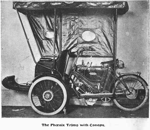 “THE ILLUSTRATION BENEATH is that of a 2¾hp Phoenix tricycle. This machine is fitted with magneto ignition. In writing to us, Phoenix Motors say: ‘We think that there is a growing demand for a really good and efficient light three-wheeler which can be started by hand and driven after the manner of a car, as is the case with this machine, it being fitted with our two-speed gear, clutch, and free engine.’ Phoenix Motors recognised some time ago the necessity of making an attachment for bicycles, and now make one called The Trimo forecarriage, which suits other makes of bicycles besides their own. The illustration shows this without the seat attached for a passenger, as it can be supplied with or without the seat. To detach the seat does not take more than five minutes. Thus the rider always has three machines in one—safety, tricycle, and forecarriage complete. This firm were practically the first to make a successful fore-carriage machine, and have had a vast amount of experience in suiting riders’ requirements in this direction. The width over all is 3ft f5in, and the approximate length is 8ft with the attachment affixed.”