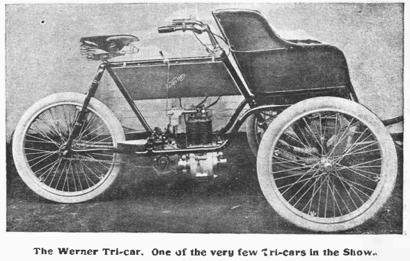 “THE WERNER COMPANY show their new fore-car with a two-cylinder engine of 4hp. The front axle is suspended on elliptical springs, and the frame strikes one as an original piece of work. The engine is mounted with its shaft at right angles to the frame, and gears direct to a countershaft having a two-speed gear of the double-clutch variety, thence the drive is by chains to sprockets on each side of the rear hub. The clutches are pedal-operated. The engine is arranged to be started by a strap. Handlebar steering is fitted. The fore-carriage is coach-built with brass edging giving it a smart appearance.”