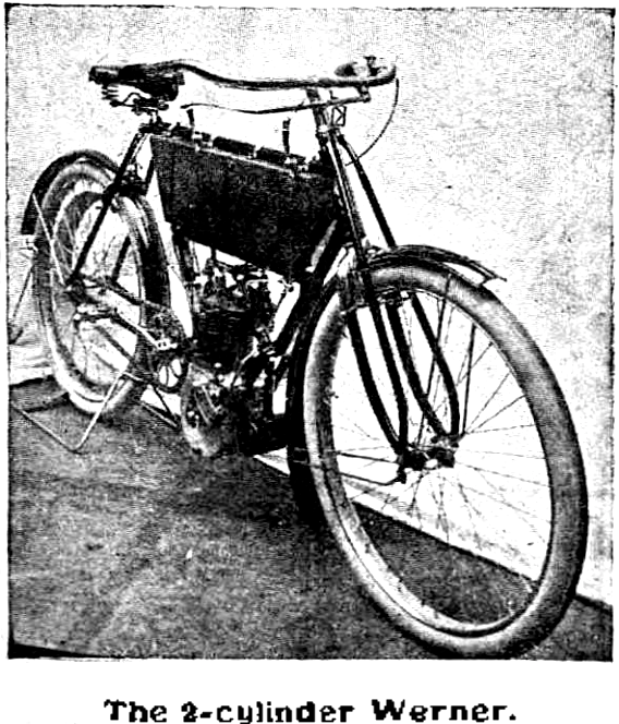 “MORE THAN A DOZEN motorcycles are to be found on the Werner stand. These include the 2½, 2¾ and 3½hp models which were exhibited recently at the Agricultural Hall. Of these the most taking machine is, we think, the 3½hp. The engine has twin-cylinders (these being parallel to each other and cast together), and the inlet valves are now automatic—the mechanically-operated ones having been abandoned; the free engine pulley is also retained, and a new rim brake adds to the control efficiency. The spring forks are a feature of the machine, as is also an electrical controller for regulating the speed. Undoubtedly, the 1905 Werner motor-bicycle is an admirable production, and well worthy of the consideration of those about to purchase new machines.”