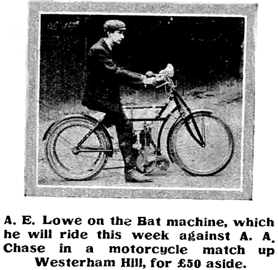“MOTORCYCLIST ASCENDS THE GREAT ORME’S HEAD. On Saturday, October 29th, Mr J Edge, of Liverpool, succeeded in riding to the top of the Orme’s Head on his 4hp Bat. The ascent had previously been made only by a 60hp Mercedes and a Lanchester car. Mr. Edge started his machine at the railway terminus, and easily mounted the first slope, which has a gradient of 1 in 12 at the start, and this quickly steepens till a 100-yard stretch of 1 in 3½ is reached. After this the rider followed the old quarry road for some distance, all the time mounting up a gradient of about 1 in 8. A cart track only three feet in width was the next stage of the ride, and here the machine stuck in a rut and threw the rider to the ground. With the assistance of several bystanders Mr Edge quickly got off again, and after a short climb up a grass-covered slope reached the summit. The total length of the road was about a mile, the gradient varying from 1 in 20 to 1 in 3. The machine was geared 5¾ to 1, and a Watawata belt was used. The 2¼in Palmer tyres were fitted with Parsons’ non-skid attachments, otherwise the ascent of the slippery grass slope at the finish would have been impossible. Mr Edge is very jubilant at his success, and is quite ready to repeat the performance.”