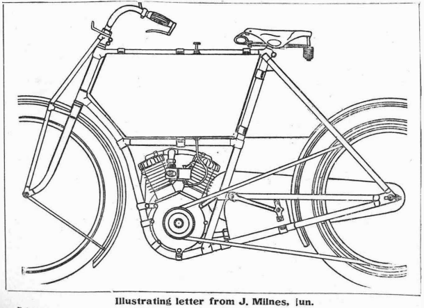 “I NOTICE A LETTER from MS Tinne; so I enclose a sketch of wiring as it was on my front-driven Werner in 1900. It was very complicated, so I reduced the wires to two only, along the top tube, one low and one high-tension. If Mr Tinne is in this neighbourhood I shall be pleased to show him how I have simplified it: if not, perhaps the sketch of the original wiring may be of use to him.