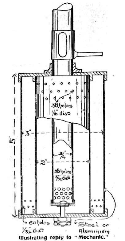 cleaning once in three months…I have often been bothered with the terminal nut or screw of a sparking plug working loose and falling off. This generally happens half way up a hill, or in the dark when it is a difficult matter to find it again. I fit my plugs now with a hook terminal…There has been a good deal of argument lately about surface and spray carburetters. I never find any difficulty in starting with a surface carburetter, but in cold weather it is always necessary to let a little fresh petrol in from the reservoir, and also on approaching any very stiff hill. No doubt when passing over rough ground you must let in more air, but this is no trouble with handlebar control…Spray carburetters seem to me so complicated, with their delicate needle valves and float which must be perfectly petrol tight. You constantly see in answers to queries: ‘See that your carburetter is not flooding’, or ‘your spray is not large enough, or too large’…Another matter I should like to comment upon is accumulators. Personally I do not believe in them. I have always used dry batteries, first the Meyra and now the Ideal make. These batteries last from six to eight months, and the firing is perfect…With dry batteries you always have warning when they are getting low by occasional misfiring, and it may be necessary to contract the gap in the sparking plug to get home; or, if you wait for a short time, they will regain some of their power. While you are waiting for a new set you can rejuvenate the old ones by boring a hole in the pitch and injecting a solution of salammoniac. Accumulators constantly want recharging. If you have no public supply at hand you can recharge with primary batteries…I have used dry batteries for nearly five years, and have never yet been stranded for want of battery power. I am much in favour of a tricycle as compared with a bicycle. With the latter on a rounded road with a greasy surface you do not feel at all safe. A tricycle will not skid unless you turn almost at right angles. On a tricycle you can keep dry and much more comfortable. With footrests’ and an