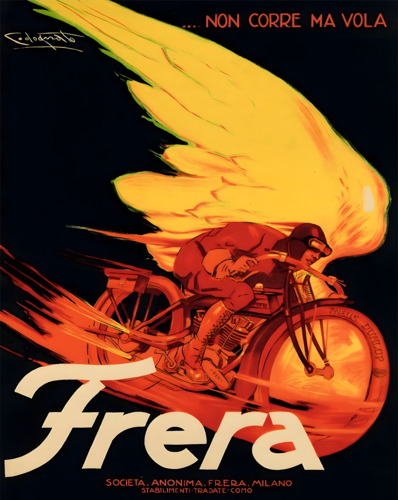 “DETAILS OF A MOTOR CYCLE of original design has been sent to us from Italy. The engine has a bore and stroke of 88x82mm, (498cc), its single cylinder is horizontal, and it has overhead valves operated by overhead camshaft. Its ignition is by two plugs and a double-spark magneto. The gear, which is an extension of the crank case, contains three speeds, multiple-disc clutch, and a kick-starter. From this the drive is taken by a chain to a shock absorber in the rear hub. Both wheels are controlled by band brakes. A speed of 64mph is claimed for this machine, together with an entire absence of vibration. It is manufactured by Carlo Guzzi.” During the war three enthusiasts serving in the Servizio Aeronautico became friends and dreamed of building motor cycles. Carlo Guzzi serviced the aircraft flown by Giovanni Ravelli and Giorgio Parodi, who was heir to a shipping and armaments business. It was agreed that after the war Georgio would provide the finance, Carlo would design a world-beater, and Giovani, who had won races before the war on his Triumph, would ride in competitions to publicise the new bike. Soon after war’s end Giovani died in a flying accident; in his memory the Servizio Aeronautico eagle emblem was incorporated into the firm’s logo. The 1920 prototype, built by Carlo with help from his brother Giuseppe, bore the name GP, for Guzzi-Parodi. But when it went into series production the name under the eagle was Moto Guzzi.
