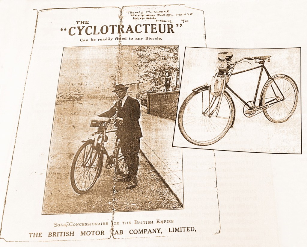“AN OIL TURBINE TO BE ADOPTED as an auxiliary power unit for a bicycle: The inventor of the bump bicycle, as it is called, has adopted a different system from our French friend…The Bump is in no sense a motor bicycle as we understand it, but is intended to be a motor-assisted bicycle…There is a cylinder attached to the saddle tube of the bicycle, provided with an’ ordinary tyre valve at the top. Air is pumped into this by means of an ordinary bicycle pump to a pressure of about 15lb to the square inch. The lower portion of the cylinder contains oil, on which a float rests, thus separating the oil from the air chambers. The pump is attached to the back of the saddle, and is operated by the saddle moving up and down, owing to ordinary undulations in in the road. It serves to pump the oil from the small reservoir over the rear wheel—the exhaust chamber, as it were—to the large reservoir, which in turn delvers it to a small Pelton wheel. This is situated on the top of the oil tank. The power is conveyed to the rear wheel by means of a chain, and the flow of oil is controlled by a lever on the handle-bars. Similar pumps can be attached to the front wheels when they are sprung…It is handled by Central Traction Ltd, 125, Wool Exchange, London, EC.”