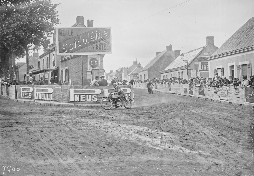 “FIFTY-TWO MOTOR CYCLISTS COMPETED in the Grand Prix race, organised by the Union Motorcyclists de France…The circuit de la Sarthe, over which the race was contested, measures 10¾ miles, the 500cc and the 350cc riders being called upon to cover eighteen circuits (193½ miles), and the 250cc lightweight riders fifteen laps (161¼ miles). Le Mans attracted thousands of visitors for the motor cycle race and the car race on Monday. Although the course had been excellently treated, it was, perhaps, natural that the 100mph cars had cut up the surface badly in practice, patches of sharp flints being encountered at intervals. Except for half-a-dozen or so difficult turnings, the course is extremely fast, with its long straight stretches, higher gears being possible than on the Manx TT circuit. A striking success was scored by British riders and machines, representatives of the home country occupying the first five places in the chief class for 500cc machines, France claiming honours in the 350cc event, and a French rider mounted on a machine assembled from British components winning the 250cc category.”