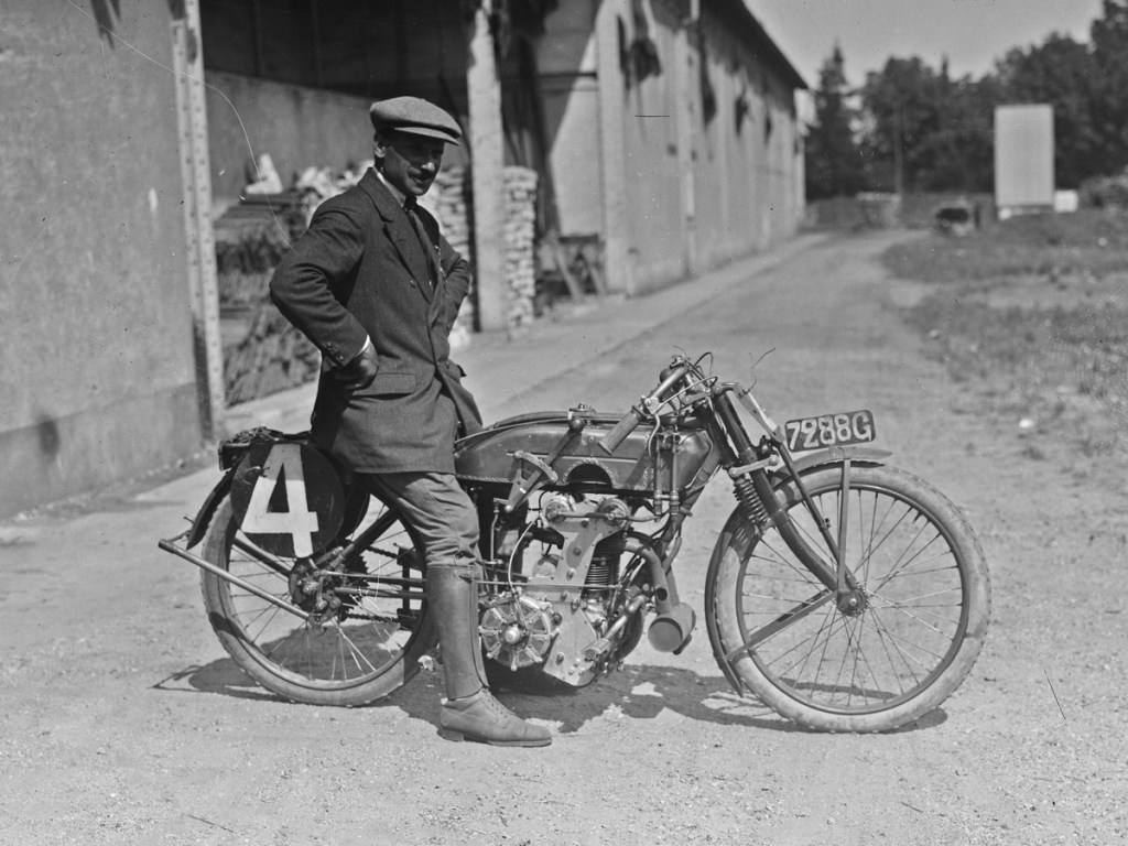 utterly exhausted, while the washers he had brought lay unrequired on the bench…Desvaux’s blue Alcyon was leading when, on the hairpin turn near Provins, the rider discovered he was out of fuel. Desvaux, who would have been a wonderful recruit for the Lifeguards, lifted up his machine, and shook it to assure himself that the tank really was empty, then ran back to the main grandstands—a distance of a mile—to get a can of petrol. Meanwhile, Naas, another giant, had been driving hard, and, by reason of this incident—for the Alcyon man lost eight minutes—had no difficulty in getting into the lead. Desvaux was soon in action, but had to be content with third place behind his team mate Jolty. Barnard (on an ABC) came in fourth, with Bartlett (an Englishman) fifth on the same make of machine. Pean, the Peugeot crack, only finished sixth. The full ABC team finished, and one of them made the record lap at an average of 61½mph…The 1,000cc sidecar race was won by Andre on a Harley-Davidson, followed by Bache on an Indian, with another Indian in third place.”