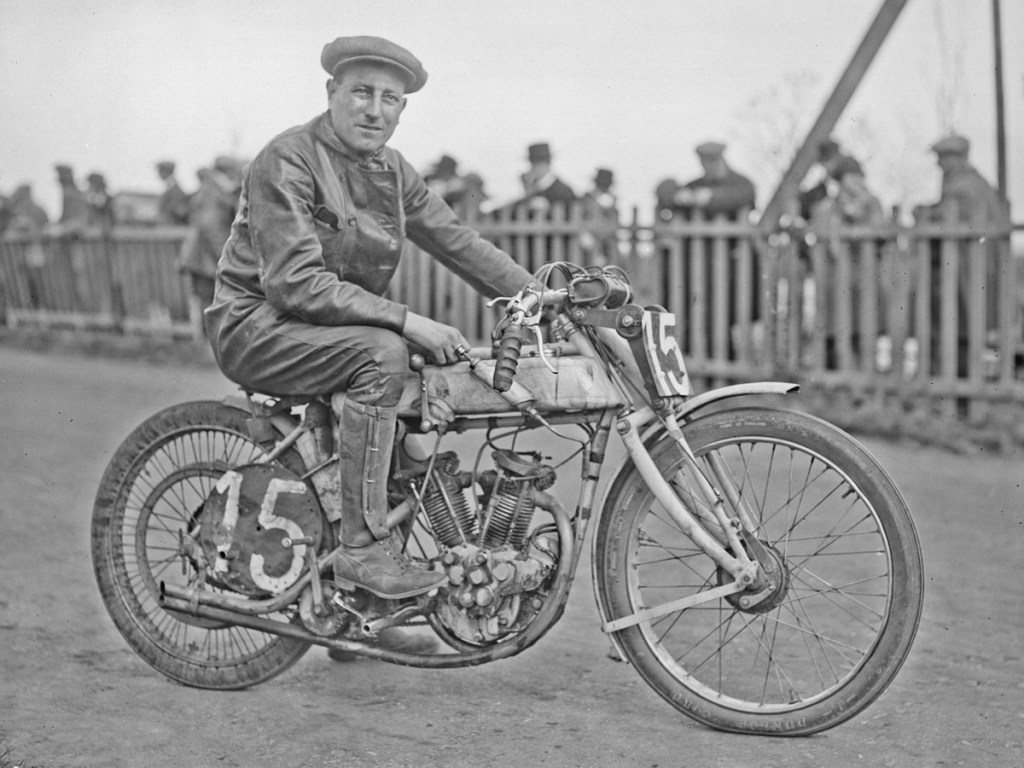 twin-cylinder Rex Acme…in the second lap Walter had trouble with the rear-cylinder plug and had great difficulty in extracting it. This lap took him some seven seconds longer than the average of his others and dropped him back to about 20th place…But Walter was unequalled when things had gone wrong. By terrific riding he tore through the field so that he was on the leader-board again by the fifth lap…I have seen many riders going down Bray Hill, but never have I seen anything like Walter on that occasion. He was absolutely full bore, flat on the tank and used every inch of the road…he was out for blood…and finally ran into second place, just over four minutes behind Stanley.” That was one of his finest rides.” Frank Longman (AJS) was third, ahead of Joe Craig (Norton) and CP Wood (HRD). Jimmy Simpson broke the 70mph barrier in the Junior, lapping at 70.4mph on his AJS. But Alec Bennett beat him into second place on a cammy Velo with Wal Handley finishing third on a Rex-Acme. Freddie Dixon (Douglas) was fourth, with Gus Kuhn fifth on another Velo. Bennett set lap and race records in the first TT victory for an overhead-camshaft engine—KTT Velocettes would be a force to be reckoned with for the next 30 years. AJS was acclaimed for extracting 10hp from its 350s; within a decade power outputs would double.