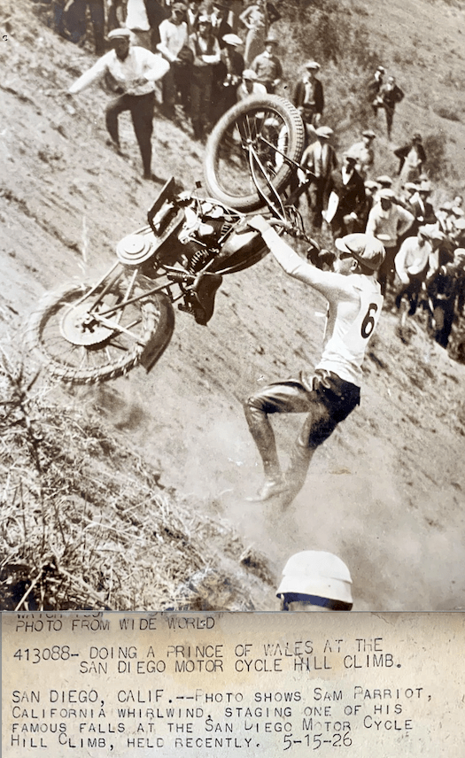 Daily Mail: “Extraordinary scenes were witnessed near Buxton yesterday when the competitors in the ISDT attempted to climb Blackermill Hill, a towering and greasy ascent in the Peaks. Riders were flung from their machines, which skidded on the treacherous boulders. Miss Cottle and Miss Bedlington embraced each other in the mud after falling. The Misses Debenham, Miss Foley and Mrs McLean made better ascents than did most of the men, spectators had to scramble for safety as motor-cycles leaped from the boulders on to the grassy slopes. Later Miss Bedlington hit a car at Cranford and had to retire with smashed forks. Miss Betty Debenham fell in front of the Dutch rider, Van Twist, who steered into a seemingly shallow ditch which proved to be nine feet deep and filled with nettles. He and his passenger were badly stung and shaken and they had to retire…”
