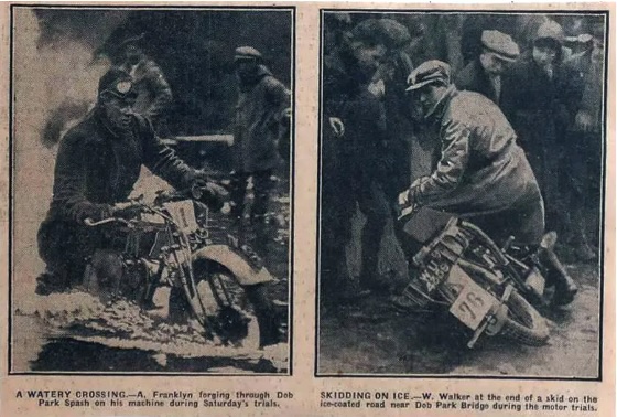 grass by-lanes very slippery, and those who had punctures of any sort found that to make up time was none too easy…the 1 in 8 Ashtead Farm Hill had substituted any semblance of green mud for greasy black mud…HB Chantrey (980cc Brough Superior) had to foot slog heavily to assist his pinking engine. In direct contrast ALS Devyer (996cc AJW) did not seem to be going much faster but never removed his smile or his feet…P Cranmore (349cc BSA sc) stopped at the foot and made his passenger climb on to the carrier, and C Weichelt (496cc DKW sc)…quietly told his lady passenger to get out and push. She did but unfortunately slipped and seemed rather shaken when she picked herself up. The open-air lunch was rather a dismal affair but competitors were still cheerful, all things considered…Foolstep was the only observed hill…PHL Lamberts-Hurrelbrinck (493cc BSA), one of the Dutch riders, got sandwiched between two travelling observers and the crowd yelled frantically to clear a gangway for the competitor…WS Braidwood (499cc P&M) missed his hear, stopped, and ran backwards…Edyth Foley (498cc Triumph) dashed along to receive a rousing cheer for the cool handling of her machine…G Gothe (Husqvarna), crouching low, again impressed the spectators with his skill in the saddle…GG Kitson (596cc Scott sc) smoked a pipe unconcernedly as he put paid to the 1 in 5 gradient.,,the two Morgans arrived with chain-shod driving wheels and ascended at speed…The following retired: CJ van Marle (249cc Dunelt) water in magneto; OB Bridcutt (249cc Dunelt), crash making up time, unhurt; Willem Smit (348cc Rex-Acme), bent forks; J Kean (499cc P&M), brakes inoperative; DF Welch (490cc OK), started too late to gain any award; G Patrick (976cc Royal Enfield sc), badly hurt as the result of an accident after the conclusion of Wednesday’s run.,,New ground was to be covered on Friday’s run and the competitors were not looking forward to climbing Hard Knott and Wrynose Passes…the morning was beautifully fine…The previous rain had played havoc with magnetos…quite a number of machines had to be pushed off…Absolutely nothing in the way of difficulty was encountered in the leafy lanes—except wide-cornering touring cars…at one blind corner HM Hicks (Douglas sc) and GG Kitson (Scott sc) plunged over the edge and