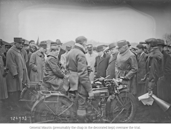 “FRENCH MILITARY MOTOR CYCLING—During the Great War motor cycles were not used in the French Army to the same extent as among the British forces, and an impression still exists among French military officers that the two-wheeler is a machine of doubtful utility on the field of battle. It was with the object of dispelling this idea that the French newspaper Moto Revue recently organised a demonstration on the Satory tank manoeuvring ground, near Versailles, before an important military commission. Twenty-five machines supplied by Rene Gillet, Gnome and Rhone, Gillet, and Motorace, took part in the demonstration. All were fitted up for some special class of military work, the devices comprising machine guns mounted on the carrier of solo machines, sidecar with wireless transmitting set, a sidecar ambulance and a first-aid machine for aeroplanes forced down in open country. During the demonstration the motor cyclists endeavoured to prove that they could perform the same work as cavalry, and while under certain conditions they failed to prove their point, in other cases they effectively demonstrated that the technical mount was superior to a horse. It was in crossing water that the motor cycles had to give way to cavalry. One of the generals took his place in a side car, but after the engine had been completely submerged a dragoon had to be sent out with a spare horse to rescue the officer.”