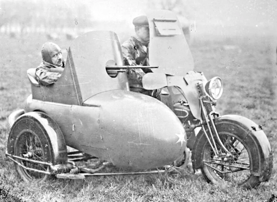 ARMY MOTOR CYCLE EXPERIMENTS—Captain CH Kuhne, of the Royal Army Serviced Corps, displayed a film showing in actual operation a three-wheel motor cycle with which the Army authorities are experimenting. It was clear that the machine (a ‘P’ Triumph) is capable of being used over roadless, boggy, marshy, and hilly country not negotiable by an ordinary motor cycle…Captain Kuhne referred to the War Offices’s experiments with motor cycle sidecar outfits. These had been found too fragile for the work demanded of them in cross-country operations…the War Office was making experiments with specially designed three-wheelers to take the place of sidecar outfits for military purposes.”