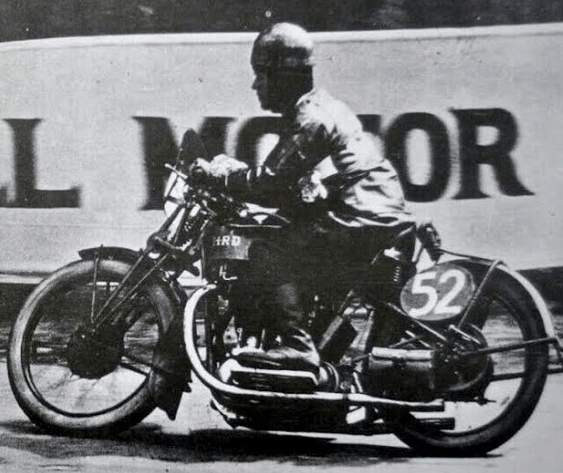 crowd settles down, in defiance of the Clerk of the Weather, to enjoy itself. Incidents during the starting period are few and far between, nearly all the riders getting under way immediately…the chief favourites seem to be Birch and Hancocks, (Sunbeams), Matthews and Provis (Nortons), Stables (Scott) and the departed Braidwood…Having seen the last man on his way, we seize our machine, and thread our way through the throng to Governor’s Bridge. Here the crowd is amazing: late arrivals are borrowing ginger-beer crates and the like, so that they may see over the head of the more advantageously-placed early arrivals. After a few minutes, the warning whistle is sounded, and Braidwood arrives, some 37 minutes after 10. Six minutes more elapse before the next man is seen; he turns out to be No 11, Hunt (Norton), and is closely followed by No 9, Dawson (X-JAP). What has become of Nos 2 and 3, Cullis and Oldroyd (Sunbeams), both fast men? They are soon through, however…Out of the mist which is coming down from Brandish corner, there appears a Scott rider and it is immediately seen that he is in difficulties. His mount is completely out of control, and just as he reaches the corner, he is thrown, fortunately clear. Another rider is already in sight, so a danger flag is waved, while willing hands— police, marshals, and press—dash to the assistance of the hapless rider, and drag his machine from the course. The forks have broken beneath the crown, and thus ends the race as far as Lomas, absolutely unscratched, is concerned. The race has now been in progress for nearly an hour and a half, so we return to the scoring board to see how the riders are faring. As we reach the start, Braidwood is just leaving his pit on the commencement of his fourth lap…So far, a great race, with nothing between the leaders. Meanwhile Braidwood is signalled at Ballacraine, his rival, Matthews, being somewhere on the Mountain. The latter’s indicator moves on to Creg-ny-baa, but the P&M riders seems to remain at Ballacraine a long time. The Norton is now at Governor’s Bridge, but Braidwood is not yet signalled at Kirkmichael. Has the marshal there missed him, or ? We wait in suspense, and presently the third lap places are put up, showing Braidwood once more in the lead, albeit by a very small margin. Limmer is reported to be cornering magnificently, and is very close on the heels of the leading pair. Meanwhile, a fine struggle is taking place for pride of place among the 350s, who are led by Thomas (RexAcme), closely followed by Gates (Velocette). And now, at long last, comes news of Braidwood. He pushes in to Kirkmichael, having retired with serious engine trouble, and so ends a fine ride. Our eyes go immediately to Matthews’ pointer. Surely he, too, has stuck; and such proves to be the case, news coming through that he has been unlucky enough to become involved with a bunch who have come to grief on a treacherous bend at Greeba. This bend, although previously almost unknown as a danger spot, has been giving much trouble to the riders. Seven are reported to have crashed here in the space of a few minutes. Thus Limner jumps into the lead…The first lap claimed nine victims—Nash (Scott), JD Potts, Brookes and Cunliffe (HRDs), Hogg (OK), Archibald (Triumph), Hancocks and White (Sunbeams), and Lomonosoff (McEvoy). A further 10 entrants had failed to survive the second lap, these being-Fletcher and Weston (Cottons), Harrington, Jackson, Kehoe and Moorhouse (Nortons), Robinson (Chater-Lea), Hanson (Velocette), Lomas (Scott) and Leonard (Enfield). Meanwhile Thomas, the 350 leader at half-distance, has retired, his place being taken by Gates, who, by three very consistent laps, retains it to the end. Soon after, Hunt comes through and commences his final lap, and all eyes are keenly watching Limner’s dial. The Norton is going