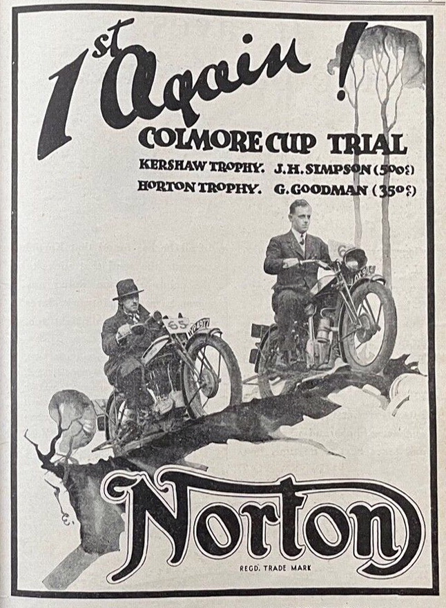 “AFTER THE THRILLING FORECAST of ‘A Schoolboys’ TT’ in the lunch edition of a London evening paper, matters seemed very calm down Carshalton way last Saturday. The Carshalton Club had undertaken to organise a trial suitable for those under 18 years of age, with result that 46 entries were received…The schoolboy atmosphere was entirely missing, in its place was a professional air of last minute bustling…very few wore school caps and only one pr two deigned to wear their school blazers. The course under the sweltering afternoon sun was bone dry, making extremely hard riding on the loose, sandy surface…Old Chalky proved the undoing of many. This scarred and rutted old veteran of Surrey is almost impossible when wet. The first man up was E Wheelwright (196cc James) quite three-quarters of an hour too early; it seemed that the newspaper was not so far wrong after all!…RT Newberry (247cc Excelsior) with a ‘Meet William’ expression of glee on his face kept well to the left, dodging under the bushes, to be followed by EA Dussek (490cc Norton); the latter literally romped up, exploring every gulley en route, and made easily the quickest ascent of the day. A moment of peace, until a familiar buzzing was heard, and, incredible as it might seem, Mr Wheelwright, amid roars of laughter from the spectators, appeared once more, this time on the third lap of his TTI Newman made an excellent climb on an old belt-drive Triumph of uncertain age; he was followed by EL Angus (493cc BSA sc), the only passenger man to arrive at the hill; at least two others had started. After a few anxious moments at the beginning of the rutted section he chose his path carefully and made the best of it. Soon after No 13, in the shape of EC Large (349cc BSA) appeared a la Denley, making a fast climb with feet on pillion footrests, the normal type being inconspicuous by their absence…the riders chased the dye to the Greyhound, Carshalton—the finish of an excellent organised trial which demonstrated the high standard of riding attainable by the modern schoolboy, at the same time giving a very excellent reason for allowing the licence age-limit to remain at 14 years.”
