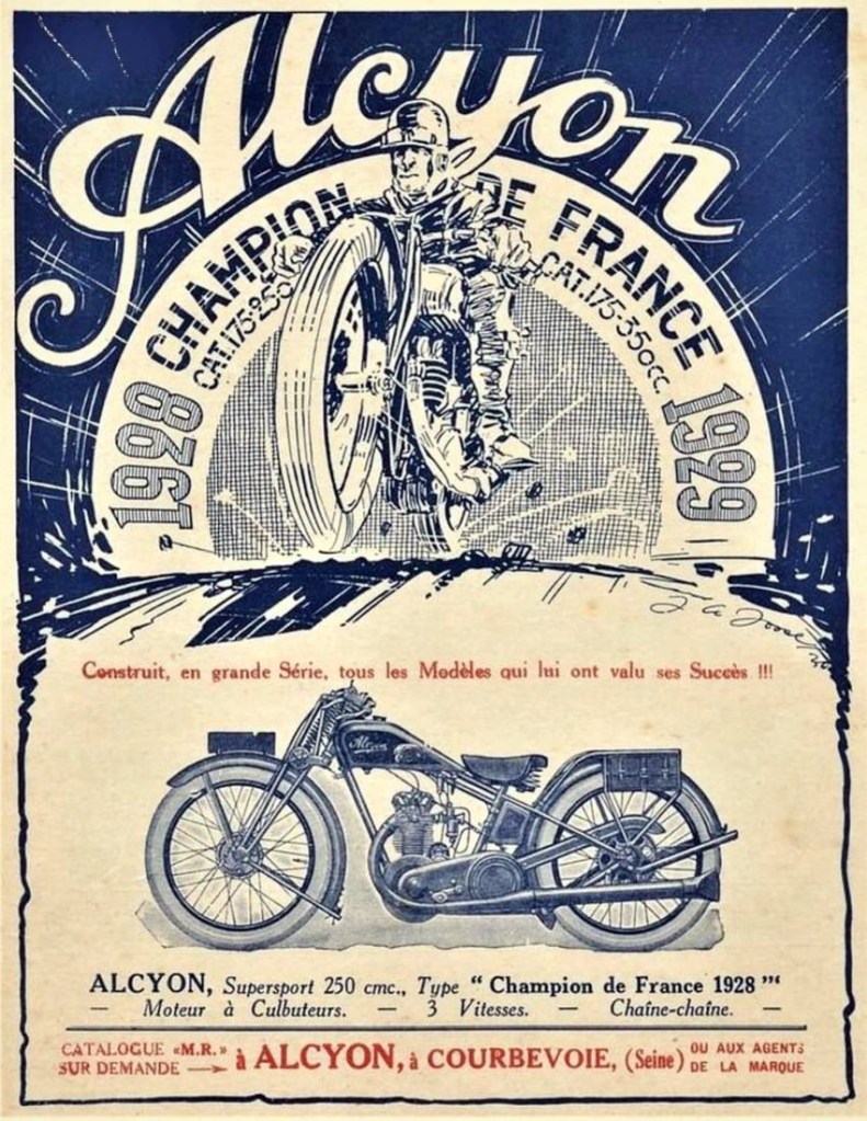 “FRENCH DESIGN FOR OLYMPIA. One of the most interesting models among the array of half-litre single-cylinder machines that will be seen at Olympia this year will be the French 500cc Alcyon. This machine embodies unit construction of engine and gear box, with shaft drive to the rear wheel, and is truly an indication of the extent to which the Continent is advancing in the matter of motor cycle design.”