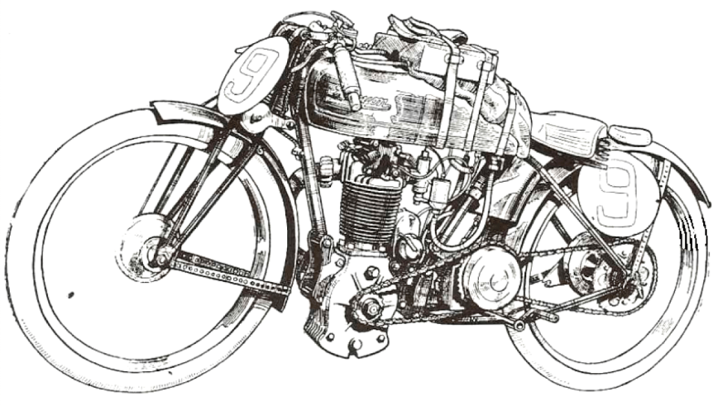 Loud cheers! That was a near do! Ernie most be all right or he could not have jumped like that. Amazingly treacherous on that corner. Must have been a local shower. The thought of a rider crashed round a blind corner has been one of my greatest fears for years, but, like most fears, it is not so bad when the actual experience comes. Still, I’m glad I was in second and not flat out in top gear! Come on, get on with it, there is thirty seconds to wipe off—what a pity it was not a massed start—Charlie and I would be in sight of each other at times if it was. Kirkmichael; Ballaugh (that’s got it to a fraction); Sulby Straight (flatter on the tank, arms in; that’s better); Sulby Bridge (a bit faster than before). Mind Temple’s Corner—rash to risk it there. All out round these bends and flat for Ramsey—BANG! What on earth is that? Most be the plug blown through the tank. Pull up quick, it may mean fire. Felt as though I’d been hit in the chest with a spent bullet. Good-bye to a win! Off, quick. No. it’s not the plug. Exhaust push-rod and tappet are missing, inlet push-rod is bent; tank is dented underneath—that must have been done by the tappet flying out. Ah! here’s a man running with something—half the exhaust push-rod. Thanks, very. good of you—interesting specimen, but a trifle expensive! Well, that has finished me—to-day there will be no exciting climax like last year’s Ulster Grand Prix, so far as I’m concerned, anyway. Two weeks’ practising—two weeks real hard work—many weeks of the Firm’s time (and much of its money) gone west. Another year to wait. And the motor going better than ever till the infernal push-rod saw fit to break. Still, it’s no use grousing, but I wish I could have had a flying lap, anyway. Where’s my pipe?…that’s better. Must get a message through to Elsie. Ah! here is Joe Sarkis pulling up. ‘What’s your trouble, Joe? No oil? Right; take some of mine if your motor will function. Here, sonny, get me a tin or something from that cottage. Give a message in at Ramsey Box for me, Joe; tell Mrs Walker, in the Grandstand—Block D, seat A1—that I’ve broken a push-rod and am walking into Ramsey and am all in order myself—Cheerio!’ This lady, hurrying, up, looks worried—hope she isn’t about to sympathise. ‘I’m sorry, Madam; this business makes me deaf; would you mind repeating it? DREW ME IN THE SWEEP?!!’ (that explains the worried look!) “‘Well, I’m sorry; if that’s the case, there are two of us unlucky to-day. You can tell your friends, however, that the money didn’t fall off; it merely faded away.’ Well, that is certainly one of my funniest TT experiences, and she seems genuinely annoyed with me, too! Oh, well, a hit of humour relieves the strain, anyway. Must try to find the missing piece of push-rod and the tappet for laboratory examination…There goes Ernie—so he is all right; and Freddie Hicks—his bus sounds beautiful. Can’t find the other pieces, so had better push the model to Ramsey. There goes Charlie—he must be leading comfortably; then Alec; and now Tyrrell…in nautical terms he is ‘showing his sternsheets’. He must have been off pretty badly, as I can see that his green corduroys are torn, exposing his white shirt. Poor kid is standing on the footrests, too, so he must be hurt. There goes Hunt; near as I can tell, Charlie is leading, with Hunt, Bennett and Tyrrell scrapping for places, and Nott well up. Warm work, this pushing. To-day’s pleasant thought: a large White Label with a very minute ‘splash’. Will call for George Dance and drink in good company. Ramsey at last. ‘What’s that? What’s wrong? Broken posh-rod—can’t be helped…thanks, just shove her in that shed—that’s fine!’ Hello! there goes Charlie on his last lap—excellent performance two years running. Well, here is the Sunbeam signalling station. . . . “Congratulations, Mr Bowers—a splendid performance. Alec second?—excellent! What about the team?…all right if Simcock comes round? Well, I hope he does, as ‘Digger’ is a good rider and a good sportsman. ‘What’s that? Mr Bowers will take me home in his sidecar? Excellent—many thanks. Well, cheerio, George, see you next year—and I hope see have as good a scrap again!'”