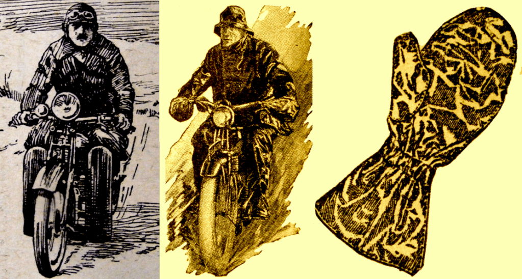 ALL-WEATHER RIDING demands all-weather kit, and, except for those butterfly souls who only license their machines for the summer quarters, any riding in the British Isles is apt to be all-weather riding. What did Browning say? ‘Oh to swim in England, now that spring is here!’—or at least something like that. Now, if you ask me, there is only one kind of kit for warmth and ‘dryth’ in this country all the year round, and that is what I call ‘competition kit’. And by competition kit I don’t mean the Scott Trial or Rough Riders’ Ramble sort of kit, where one has to sacrifice weatherproofness to agility and a reasonable chance of keeping cool when rough-stuffing. No! I mean the ordinary trial riders’ attire as assumed by the great majority of those knowledgeable fellows who ride in winter trials, all-night runs and six-day events. Practice has made perfect, and they have become as skilful in avoiding discomfort from the elements as they are cunning in getting round rules and regulations. Starting from the feet upwards, I regard full-leg-length waders as the first essential of the all-weather kit. Above the waders a rubber coat (or sleeved-cape is the better word) of the poncho type will keep out the worst kind of rain, especially if there is plenty of scarf round the neck, and on top of all—crowning the noble edifice of man, as it were—an oil-skin sou’wester. This kit is absolutely stormproof; but (shall we say?) it looks it, and many ordinary riders object to looking like deep-sea fishermen. But what would you? Deep-sea fishermen don’t look like deep-sea fishermen because it is necessary to look like that to catch fish. They look like it to keep dry under very wet circumstances, and the same applies to the motor cyclist who insists on keeping dry above all things. Now the kit I have described does not make any special provision for warmth—it is wearable in summer. In winter it is desirable to clothe oneself for warmth before the all-weather garments are assumed. Thus I would strongly recommend whatever sort of ‘undies’, if I may mention the matter, the individual person finds most comforting and heat-retaining, while a good rough tweed suit cannot be beaten for conserving bodily heat by virtue of the peculiar texture of the material. Then I would suggest, for those cold souls who need all the clothing that they can get on, that a woollen pullover, or much better still, one of those woven-but-look-exactly-like-suède golfers’ jackets is most desirable. The last-named garment I think is even better than a leather waistcoat (although I often wear one myself) of the sleeved variety; the only snags with the leather waistcoat are that unless it is warmed and aired before it is put on it feels uncannily and clammily cold at first; and if it does happen to get wet it is still more clammy and takes an unconscionable time to dry again. Scarves? Yes, one must have one big one that can be wound twice round the neck, or two shorter ones in really cold weather. One of my friends, who does a lot of winter riding, always wears a scarf topped by a big turkish towel, which, being very absorbent, arrests all those uncomfortable trickles that sooner or later try to get down the back of one’s neck. It is not a bad idea. Perhaps, at this stage, it will become glaringly evident that I have not mentioned gloves. Actually, in a real continued downpour I prefer to ride without gloves, but if the cold is too intense for the hands then something must be worn; I personally have failed to discover any gloves that are permanently waterproof, but I have heard of some rubber gloves that are on the market, and they are said to be the goods, though inclined to get clammy inside. I have kept hands warm and dry for fair periods in those big, loose-fitting army-type leather mitts which have just the thumb and first finger separately accommodated; a pair of thin woollen gloves inside these provide ample warmth, but I do not like them because they destroy the firmness and sensitiveness of one’s grip on the handlebars. Actually I like ordinary washleather gloves only, but, of course, they have a blotter-like propensity for soaking up water, and apart from breaking the full force of the wind, they are useless in rain. Handlebar muffs are thoroughly to be recommended, although they are scarcely personal kit, being accessories of the machine—like leg-shields, which are another desirable fitting, but one which I do not favour personally as I find that I write-off quite enough footrests per year without adding to the items of a writable-off character. As I said before, my ideal kit is of the deep-sea fisherman type, but for those less boisterous occasions I can and am prepared to recommend an alternative. From the waders I will not depart, however, although I am told that waterproof spring-on gaiters (especially those that incorporate a full golosh to cover the shoes) are very good. I stick to the wader personally because I can wear an ordinary lounge suit, glad socks and light shoes and step right in or out, as the case may be, in a moment, clean and tidy, even if I have had to wallow in pools of mud and water. Thus, I say, I stick to the wader. As an alternative to the poncho, which I must admit I regard as a bit of a curse because it is awkward to pull over the head (especially when one wears glasses) and anyway ruffles the hair abominably, I often wear a trench coat of the oilskin interlined variety. There are lots of these coats on the market, and I can not say that I am absolutely pleased with any of those I have tried. There are various reasons, the chief being that sooner or later they do let in water, especially at the crooks of the arms. I don’t mind that so much, as it is a fault that only arrives with age. But my biggest grouse is that the skirts are seldom full enough in front to remain wrapped round the knees unless pulled taut by rather awkward tabs and buttons. I think the faul