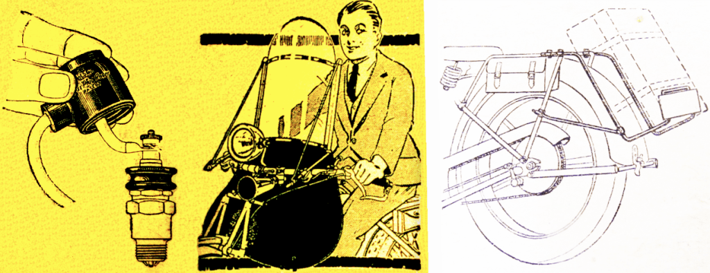 “Your continual advocation of machines for the tourist and ‘general’ motor cyclist, and your emphasis of the danger of stagnation of design resulting from the ‘speed at any price’ policy, must have hearted considerably many men who, like myself, regard a motor cycle as a means of pleasurable and economical transport rather than as a sports outfit. There are two items in the very desirable ‘Renaissance;=’ of motor cycles, however, which I take the liberty of adding to those with which you have so exhaustively dealt: (1) The rendering of a motor cycle a compact unit instead of a collection of apparatus. (2) The adequate provision for the carriage of luggage, etc. Those who traverse bush roads in summer need no reminder of the enormous amount of work involved in keeping the machine tolerably clean, and when removing caked red dust from innumerable ‘dirt traps’ we sigh for a clean crankcase-gearbox-magneto-oil pump which could be wiped bright with the minimum of inconvenience…Now providing provisions for the carriage of personal luggage…My ideal equipment…would be…The carrier to be built well forward so that the front cross member may be used as a hand-rail by the pillion passenger, and also that the maximum weight may be over the centre of the wheel. Brackets to be welded to the side stays for the optional attachment of large metal pannier bags.