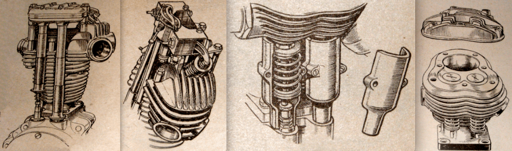 ON A MORE MUNDANE NOTE, AJW’s range of big twin and singles were joined by a range of two-stroke lightweights with the ubiquitous Villiers engines and Albion three-speed boxes. “The greatest interest,” according to the Green ‘Un, “attaches to the design of the frame. The main portion of this is made from two malleable castings running from the rear spindle to the front of the engine—one on either side. These are of D section until they reach the gearbox, whence they get very much deeper and form a solid mounting for the crankcase and gearbox…The gearbox can readily be detached through a suitably sized square hole in the side of the casting. The rest of the frame is built up of ordinary tubes, trapped, and using bolts instead of brazed lugs. A pair of long tubes run from the rear spindle to the top of the steering head, tapering all the way….Saddle tanks holding both petrol and oil have the Villiers sight feed mounted centrally between the two filler caps, and there is also a route card or map holder frame…for an extra £3 these models can be supplied ready for competition work with upswept pipes, Petrolflex tubing, ports tyres, number boards and non-inverted levers covered with rubber…Any of the four-stroke models can be fitted with a spring rear wheel working on a principle which gives very little unsprung weight, and is unobtrusive in appearance. The rear fork ends are altered to take two vertical tubes one on each side of the rear wheel. These tubes carry large phosphor bronze bushes in which slide two further members with forked bottom ends to take the axle. The movement of these inside sleeves is controlled by two main and two rebound coil springs, which abut against a solid block contained inside the sliding sleeves (these latter are slotted vertically so that this block can be pinned in position through the outer casing). The tops of the sliding tubes are bridged by a heavy cross-piece which is concealed by a metal cover made in one with the rear mudguard. The brake anchor arm is taken from this bridge piece. The rear wheel has a maximum vertical movement of 1½in, and the tensioning of the rear chain is automatically controlled by a spring-loaded jockey sprocket mounted on the lower near-side chain stay. The final model in the range is the special four-port Anzani, which also has a four-speed Jardine gearbox and is sold fully equipped.”