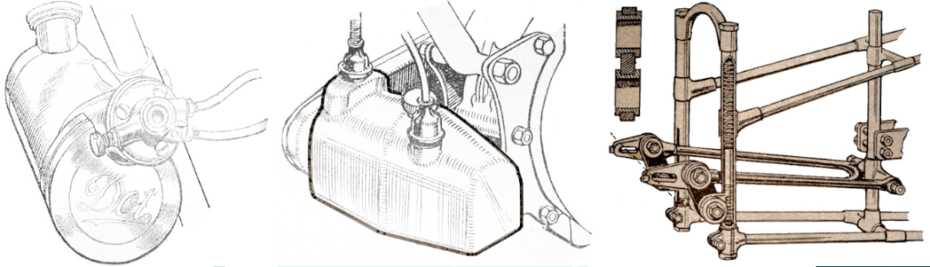 “FRAME DESIGN HAS ALWAYS been an oustanding feature of SOS models. For 1930 even further improvements have been made in this respect, and the latest frame embodies many ingenious ideas. It has welded joints throughout, and the main frame consists of continuous tubes bent round the head, rear wheel. and below the engine, the tubes being arranged in duplicate. This duplicate construction is braced by a steel tray which protects the whole of the engine and gear box and stiffens the construction to an enormous extent…the gear box is bolted to square-section tubular runners above the steel tray. Flat steel strips are bolted along the bottom rung of the frame, and are drilled in such a manner that both footrests and brake pedal may be mounted in any position to suit the convenience of the rider. The whole frame layout is most ingenious and sturdily constructed.. On the Villiers-engined models an oil tank is let into the space between the duplex top tubes; although constructed entirely separately from the main saddle tank, it is permanently fixed between the duplex fuel tanks.”