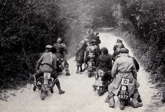 “THE VERY IDEA of plodding up a leaf-mould galley while hampered by a pillion passenger might horrify today’s trials riders; but in pre-WW2 days, one of the most popular events in the Surrey calendar was the Carshalton MCC’s annual Pillion Trial. The eighth trial in the annual series attracted a very good entry of 79—among them quite a few well-known names, such as Karl Pugh, Bernard Matterson, Mike Riley, Len Heath and Teresa Wallach. Starting at the Barley Mow, Betchworth—with the scars of the Box Hill quarries prominent in the background—the 49-mile route was laid in the Dorking-Guildford area. Because there had been no rain for several days beforehand, the course was ideal for pillion-trialling, though if the day had been wet there could have been much bother. Opening section was Goat Track, on the side of Box Hill, where a stop-and-restart test was held. Other hazards on the route card included Old Westcott, Oristan Lane, Prohibition Alley (sticky mud and a water-hole, where Len Heath’s 497 Ariel, and Mike Riley’s 498 Levis, were outstanding), then on to Buckshee, Last Straw and Coldharbour. Worst section of the day was Claypits, where the crowds lining the sides of the track were so thick (take that as meaning what you will) that competitors were forced to stick to the muddy slot in the middle. That led to a protest or two, and some riders were allowed a re-run. Overall winner was Len Heath, and although passengers’ names were not quoted in the programme, we do known that on this occasion (according to Motor Cycling’s report) the chap keeping the rear end of the machine down was KR Bott. The Carshalton Pillion Trial had been instituted as something of a propaganda exercise, to show that pillion riding, even under arduous conditions, was perfectly safe (a vociferous parliamentary lobby had been trying to get it banned). However, it would appear that 1935 was the last year the event was held; perhaps the Carshalton lads felt they had made their point.”—Bob Currie