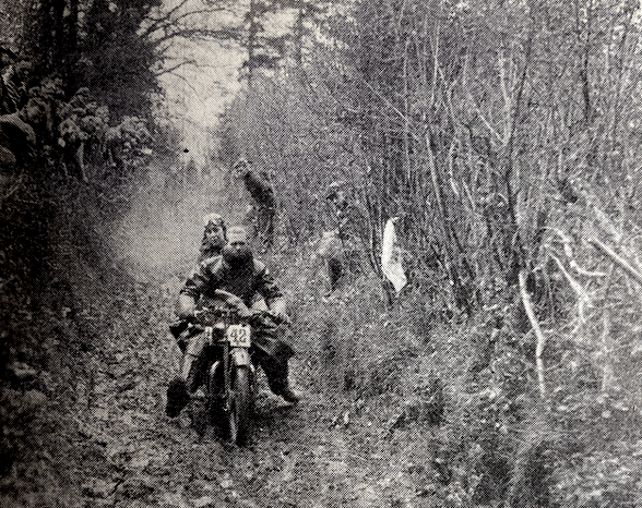 for the riders were sent down one side and had to turn round across some ruts and ride up the other side—a test which called for a lot of slow-riding skill. Here EJ Heath (497cc Ariel) had a very exciting time, shooting up the wrong bank. Nevertheless, he was feet-up. Stanley Woods, (490cc Norton)—it was strange to see this famous road-racing man in a reliability trial (though he does plenty of it in Ireland)—and R Cotterell (497cc Ariel) were both very good, but Jack Amott (348cc Triumph) had to dab once. GW Fisher (348cc Baughan) nearly emulated EJ Heath, but got out of his difficulty a little more easily. Jack White, on an oldish side-valve Sunbeam, was excellent and, after the worst was over, gave vent to an artful chuckle that greatly amused the spectators. Station Lane being in very easy condition, Ashmeads provided the next piece of excitement. This long, greasy climb had an awkward rut at the top which caused any amount of bother for the solo men. GF Povey (499cc BSA)took the hill as it should he taken—flat out, and stylishly at that. CH King (493cc Douglas) nearly rammed L Crisp (493cc Triumph), while J Douglas (498cc Douglas) sidled up at speed with his rear wheel in the rut. Both Jack Williams (348cc Norton) and GE Rowley, riding a 495cc ohc AJS with hairpin valve springs, were absolutely star, while Len Heath (497cc Ariel) was just as brilliant. FE Thacker (348cc Royal Enfield) struck a note that is unusual in these days by sitting firmly in the saddle all the way up. While Hazelwood Hill was moderately easy for the solos, the sidecar men. had the greatest difficulty in keeping on the move. The first section was narrow, with a deep gully on the left, while in the second section the gully was on the right, being at its deepest on a right-hand bend. In the second section HS Perrey (645cc Triumph sc) lost his rear wheel in the gully and headed straight into the bank. WS Waycott (348cc Velocette sc) also fell by the wayside, but RU Holoway (348cc Dunelt sc) was brilliant and got round the bend and clear of the section before be ended up on his side. NP0 Bradley (599cc Sunbeam sc) was the only sidecar man to get through the first section clean, but was unlucky enough to break a chain in the second. HJ Flook (490cc Norton sc) amazed everyone by getting round non-stop, with just two frantic kicks to avoid turning over. He was followed by. AE Morris (499cc Baughan sc), who was nearly as good, but stopped momentarily. DK Mansell (490cc Norton sc) also managed to reach the top like Flook—with a couple of hefty lunges at the bank. ‘BB2’, notorious for its high step and slippery rock outcrop, was a little easier than usual. Stanley Woods and Jack Williams, on their Nortons, Len Heath (Ariel) and Rowley (AJS) all rode to perfection, as did Perrigo (499cc BSA). RS Bond (248cc Triumph) carefully rode round the step until the model elected to throw him. Quite one of the best was L Crisp (493cc Triumph), who was obviously having an ‘on’ day and at the top of his form. On the second circuit the stop and re-start test on Shadwell