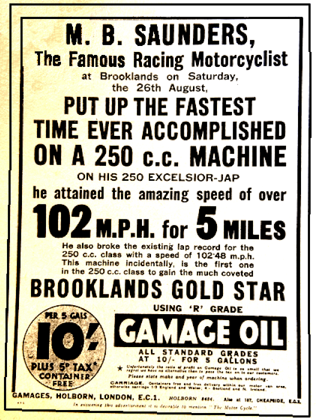 “A BIKE WHICH wears a very hand-beaten sheet-alloy overcoat is the only 250cc model ever to win a Brooklands Gold Star for beating 100mph during a British Motor Cycle Club race meeting,” writes Bob Currie. “A 246cc Excelsior-JAP, it performed that feat in the hands of Monty Saunders during the Three-lap Junior Handicap at the Hutchinson Hundred race meeting. Motor Cycling reported at the time: ‘In the first race of the afternoon (and there were five short races besides the Hutch) success at last attended the efforts of MB Saunders to establish his Excelsior-JAP as the world’s fastest 250. Formerly, this honour had belonged to a New Imperial, ridden by Archer last year. All through the year Saunders has been striving like a Trojan to earn the first Gold Star to be awarded to a 250; to do this of course, it was necessary to turn a lap at 100mph or over actually during a race. With exasperating persistence the weather conditions—a vital factor with these small engines—had been against him all season, so that it had been impossible to use to the best advantage the streamlined shell belonging to the little Ex. On Saturday everything was right. On went the streamlining. Up went wick. Bang went the record!’ (The enthusiastic writing style is such that, although not named, it could only have been Dennis (‘Castor’) May who turned in the report.) ‘From a standing start Saunders, turned the track at 88.15mph. Next lap 102.27mph, third lap 102.48mph. Hi) previous best during a race had been 99.21mph. It seemed a considerable shame that such extraordinary speeds should only have sufficed to earn third place. Nevertheless, excuse can perhaps be found for the handicapper in this case, for winner CK Mortimer (146 New Imperial) has a most disconcerting way of piling on a matter of an extra three of four mph at each meeting! And it is only natural to suppose that it must stop somewhere. Mortimer’s fine winning speed of 68.31mph was aided by some very competent-looking streamlining of the bottom end, looking like a huge egg.'”