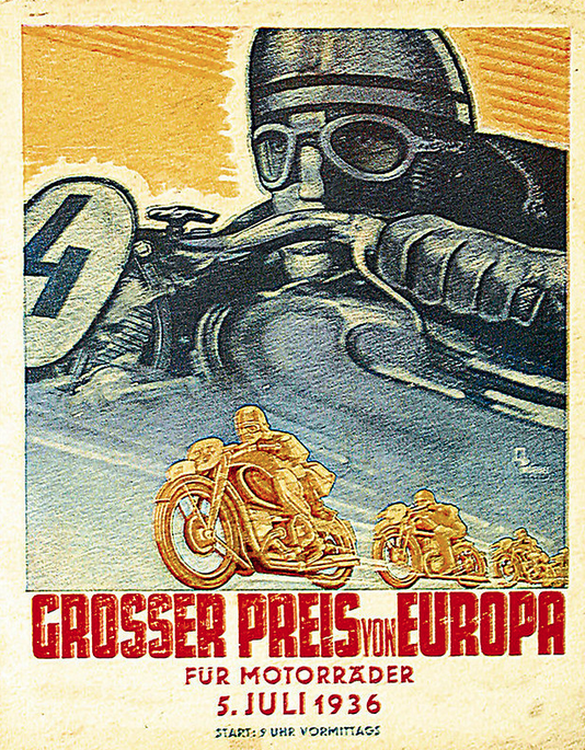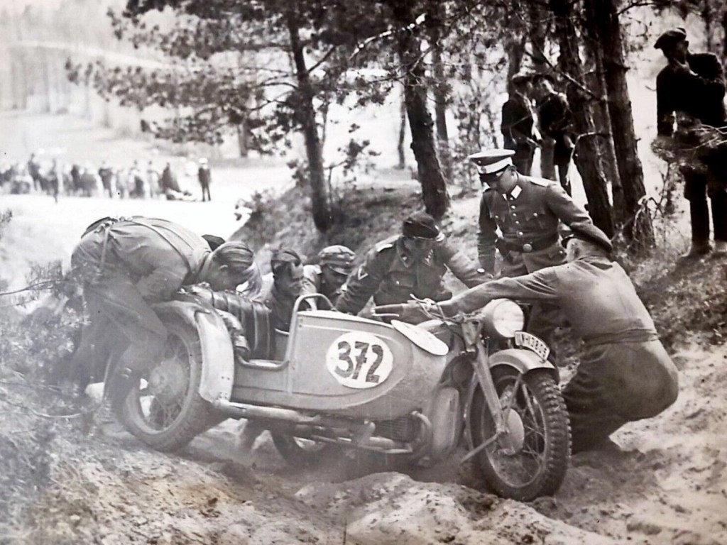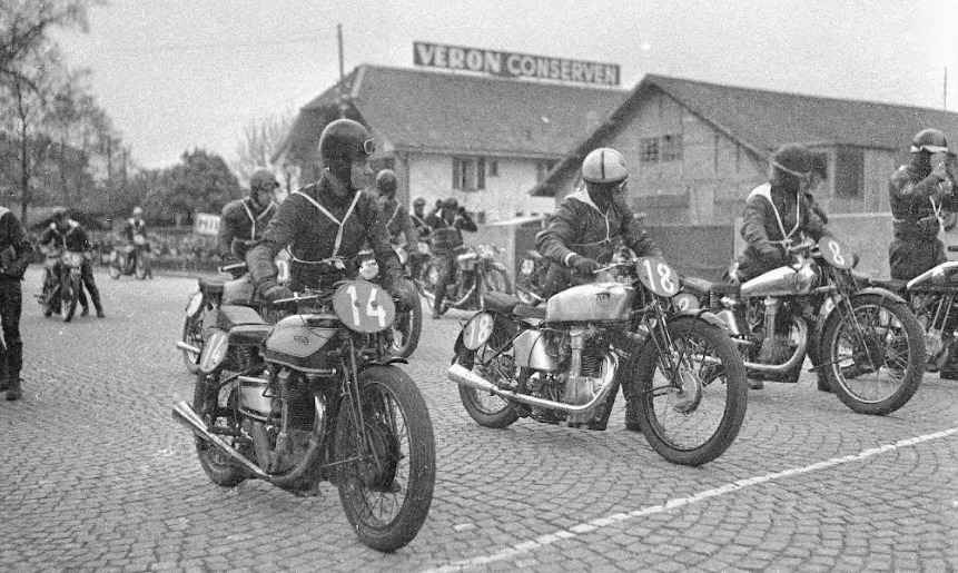 Only one minute until the start!) A few seconds later the light is at yellow, and then simultaneously with the nerve-shattering explosion of a maroon the green light appears and they’re off. The rain has ceased, but it is very dull and overcast. In spite of the weather the vast crowd, which has patiently stood all round the course since 8am and possibly earlier, is all agog to see the riders off on this the most important event of the day. It is going to be a terrific race: The Guzzis are known to be exceptionally fast. The BMWs are possibly a shade faster, while the senior DKWs, judged on their practice form, are something to write home about. All this is a knotty problem for the Norton camp to tackle; White and Guthrie (Nortons) are the only British riders in the race. However, at the end of the first lap, with all the riders in a bunch, the flying Scotsman is in the lead. Close behind are Steinbach (DKW), HP Müller (DKW), JH White (Norton) and Fleischmann (NSU). On the second lap the positions are unchanged, but the next sees a gradual thinning out of the field. Guthrie is clear 20 seconds ahead of Müller (DKW), who has overtaken Steinbach (DKW). White is sitting on the heels of the DKWs, obviously riding to orders. But where is Tenni and the Guzzi? At last over the loudspeakers comes the news that he has crashed beyond Hohenstein, though without serious results. Then Gall (BMW) drops out, leaving 0 Ley to carry on the name of BMW alone. Six laps later Guthrie has definitely. established a lead over Müller’s DKW, while Steinbach has a grand tussle with the DKW rider for second place. Lap after lap they fight it out; first it is Steinbach, then it is Müller, while White (Norton) holds a watching brief just behind. Fleischmann (NSU), in fifth place, struggles to keep away from the ever-pressing Ley (BMW). Half distance sees Guthrie come in for a pit stop, while White proceeds to overtake the DKWs and lie second. Then the two DKWs come in. By an unfortunate accident Steinbach gets the full force of the boiling -water from his radiator in his face and all over his leathers. With the consequent pain he drops his machine and nearly knocks Müller over at the same time while fuel goes gushing over both of them. As a result their pit stops, instead of taking 30 seconds, last for nearly a minute and a half. This slip rather spoils the excitement of the race, for Guthrie and White are well ahead. Ley (BMW) comes in for his stop and likewise makes it rather a long one; he appears to change a plug. The delay lets Fleischmann into fifth place. The order of the leaders remains unchanged until the 32nd lap, when Mansfeld (DKW) comes into the picture, displacing Fleischmann from fifth place. Meanwhile Müller (DKW) has been creeping up to White (Norton) and by the 37th lap—only two more to go—he is just eight seconds behind White, the latter having come off on the bend in Hohenstein. How tho crowd loves the scrap! Müller was actually level with White as they passed the stands—everyone went delirious with excitement. The end of the last lap sees Guthrie (Norton) cheered to the echo—an easy winner. But actually the crowd is much more interested in who is going to come out on top in the White-Müller duel. At last these two can be heard, then seen swooping down the dip to the last bend. White is ten feet in front! The excitement is terrific, with the crowd yelling itself hoarse. Then comes the real climax. White goes wide and strikes the hay barrier on the last corner, while Müller nips round on the inside and is away before White can get going again. More amazing still. Muller on his last lap has broken the record for the course, at 82.63mph. Just as there was a battle for second place, so is there another for the fourth position, between the DKW riders, Mansfeld and Steinbach. It looks like a victory for the latter, but on the last lap Steinbach falls and lets H Fleischmann (NSU) and Sunnqvist ( Husqvarna) into fifth and sixth positions. Once again it has been a British victory, and once more the crowd stands motionless with arms upraised for the British National Anthem—and how they cheered when Guthrie received Herr Adolf Hitler’s prize and a special message of congratulation.”