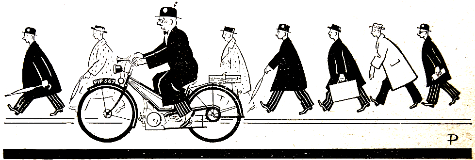 “D0 YOU CONSIDER, demands a. correspondent, that all autocycles should have two speeds? In theory—yes! In practice—no! SF Edge once mouthed the adage, ‘The smaller the engine, the more numerous the gears’—which is sound common sense. But in practice an autocycle is not so much an engineering ideal as a concession to the three canons of cheapness, and simplicity. Being myself so large that if I were still in my twenties and knew more about boxing I could massacre Joe Louis, I take a dim view of single-speeders for my personal use. Moreover, when I can have four speeds with a £15 pedal-cycle weighing only 301b, and an unlimited number on a car, I feel it is rather foolish to get put off with one gear on a motor cycle, however light and cheap it may be. But I surrender gracefully to the fact that lots of normal-sized men and women are perfectly content with one-speed autocycles, and being a democrat, I have not the least desire to interfere with their simple pleasures. Obviously, if an autocycle were mass produced, the addition of a simple hub two-speed would not add more than fifteen shillings to the cost, while adding much to convenience…Yesterday I overtook a cop riding an autocycle. A very large cop. A sergeant, too. In his helmet. About an hour later I was overtaken. By a slimmish girl in slacks. Riding a large Harley. Probably 1,200cc. She had a fat man on her carrier.”—Ixion