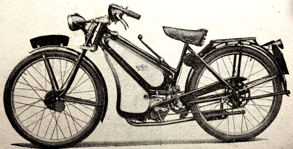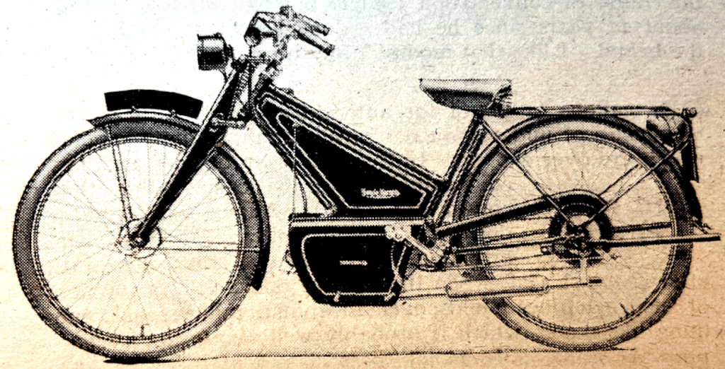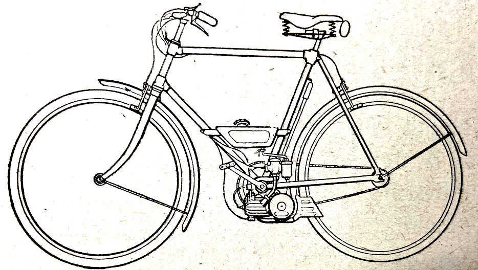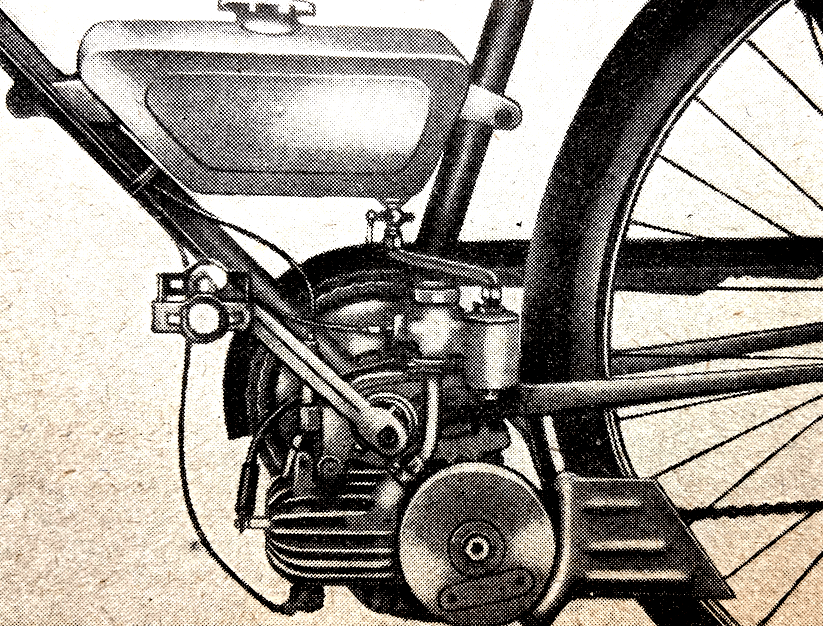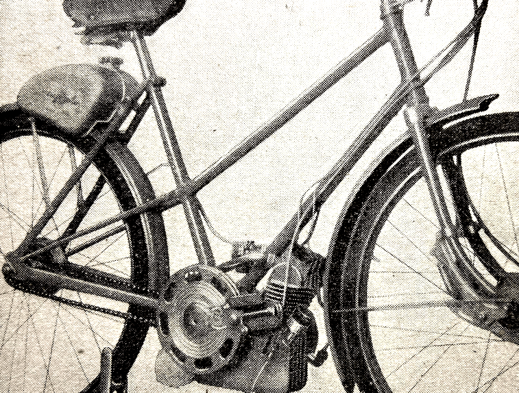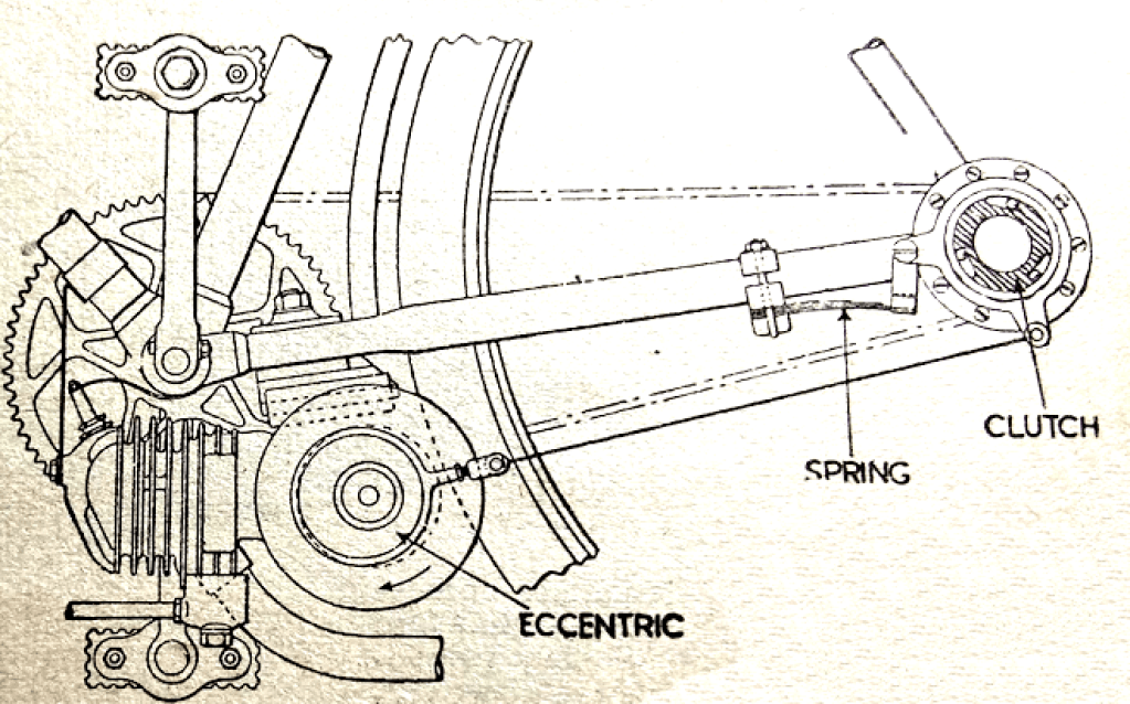 “A NOVEL METHOD of power assisting a pedal-cycle has been patented (No 581,866) by BSAs and Mr VJ Stohanzl. Below the bottom bracket of the bicycle is a tiny engine which may be slid backwards till a flange on the inside of the flywheel makes contact with the rear tyre. The engine is thus started. On the outside of the flywheel is an eccentric which by means of a tension wire is connected to a one-way ball-type clutch on the hub of the rear wheel. An arm from the outer member of the clutch is connected through a bracket to a quarter-elliptic spring on the fork tube. When the engine is running the outer member of the clutch is, say, first pulled clockwise by the tension wire. The fork tube spring is therefore loaded till the eccentric turns far enough to relieve the tension wire. This allows the fork tube spring to react and drive the rear wheel through the clutch. It is intended that the engine shall be of very small capacity to serve as an auxiliary to pedalling against head winds or uphill.”