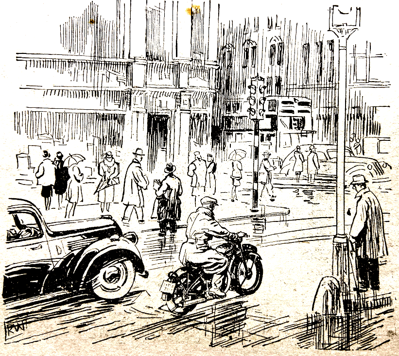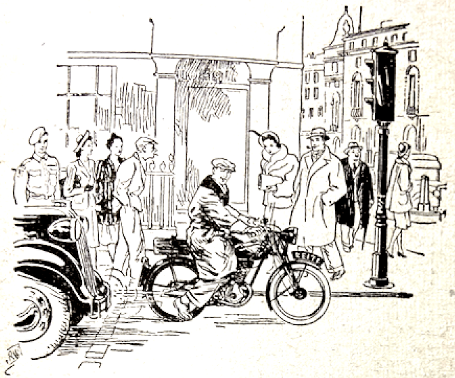 know—but they can ride and ride well. I salute these gentlemen of the road. So often when one thinks about riding that gains 100 marks out of 100 one has in mind trials and road-racing stars, but they are not the only craftsmen. Among the 400,000 and more who make up the ranks of motor cyclists are many thousands who never appear in the limelight, but who day after day give exhibitions of riding which, if not second to none, are at least to be classed with those of the gentlemen of the heavies. What does traffic riding demand? Two things stand out in my mind. One is the correct placing of one’s machine. The second is deft handling of the throttle. A point closely related to the latter is proper maintenance. A machine which is in poor fettle may not be too difficult to handle on the open road, but get in traffic, with the halts at lights, merry-go-rounds and the call for smooth acceleration, and the difference between a machine which is right and one which smacks of a bag of nails can be colossal…One finds that the lad concerned stays in gear instead of slipping into neutral—he cannot find neutral readily or engage bottom gear from neutral without a scrunch because his clutch is not freeing and because he dare not let his engine revs drop. Hence, and because their machines are, in effect, tools of their trade, one finds that many of these ridden-to-work motor cycles are among the best maintained—far better than many of the machines used solely for pleasure.”—Torrens