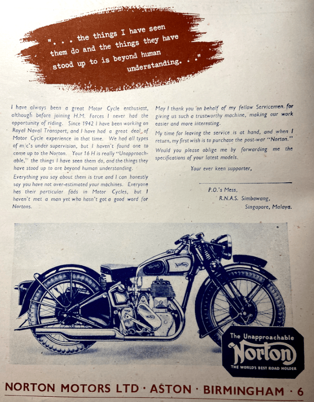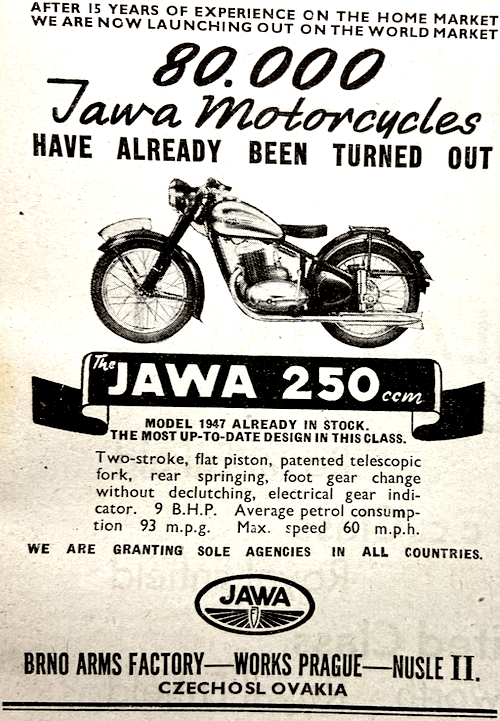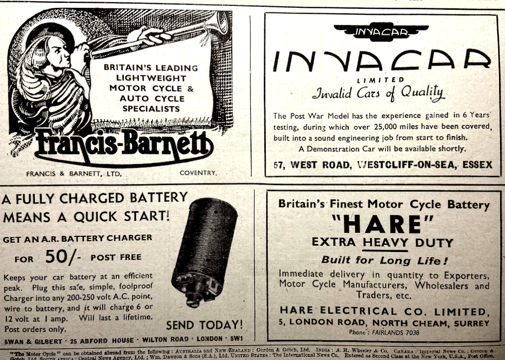 “MAJOR HR WATLING, director of the British Cycle and Motor Cycle Manufacturers’ and Traders’ Union, says that the industry, in spite of controls and shortages of materials and labour, has already passed the export target that it was set of improving the value of its exports by at least 75% over pre-war. The industry was now playing ‘a most important part’ in the country’s export trade.”