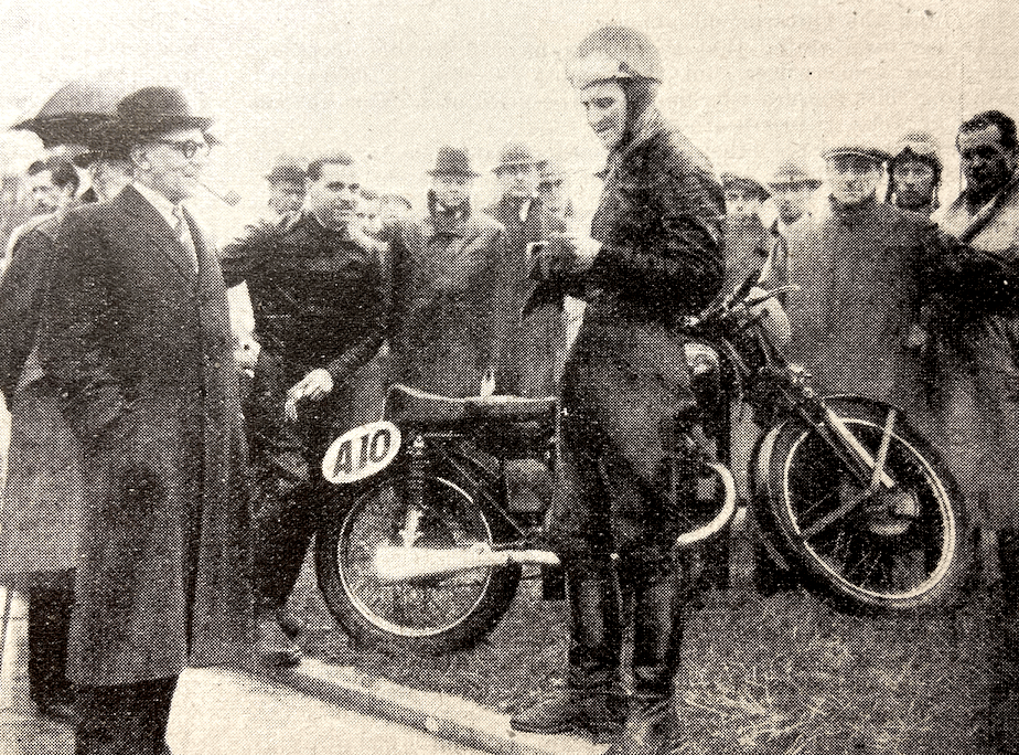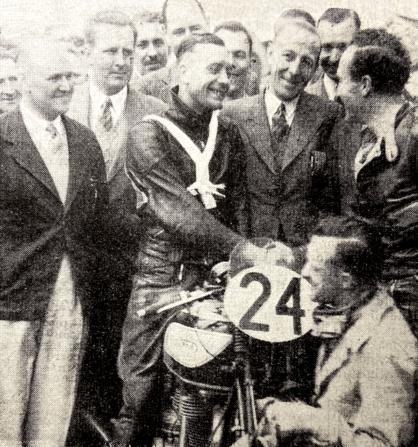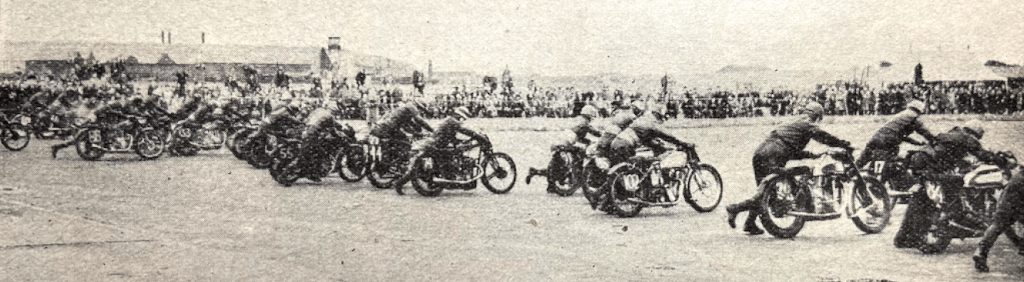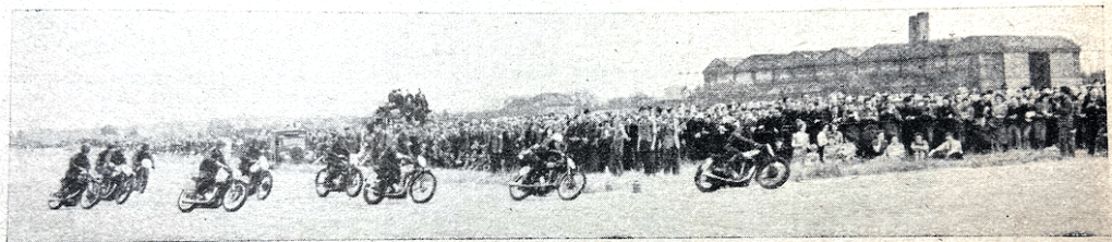 Georges Houel (348 Velocette) started tardily, and E Andrew (348 Norton) arrived at the line late when the field was about 200 yards away. PH Hylton (Norton) held the lead till the fifth lap, when he was passed by C Beischer (Norton), who remained in front to the finish. Behind these two riders, R Tolley (Ariel) and Wood were having a stirring battle, which HWG Ditchburn on an ex-Jock West Hartley Ariel, joined near the end and in time to displace Wood from fourth place.No fewer than six riders, including HL Daniell, were left on the line in Heat 3, which WL Dawson (DKW), JM Crow (Norton) and R Wise, on his JAP-engined Royal Enfield, dominated in the early stages. When the race had settled down it could be seen that ST Barnett (Norton) and Daniell were coming along rapidly, with VH Willoughby on his 350 Velocette making some of the five-hundreds appear slow. Wise retired on the sixth lap when in the lead, and thereafter Crow was the undisputed winner. Barnett was second and Willoughby third. Daniell, who had been gaining about 2sec a lap on the leading men, was content to ease off towards the end and finish fourth. The first heat of the 250cc class gave Fergus Anderson an opportunity to show the paces of his Guzzi. He led from the first lap to the end. In so doing, he made the best 250 time and won the event…”