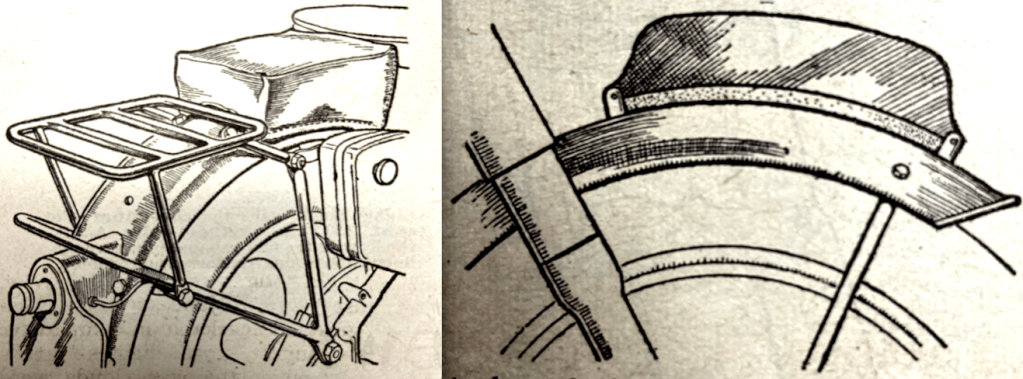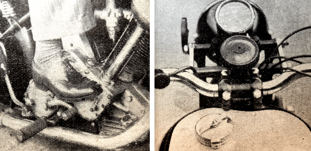 “I FANCY THAT far more riders would avail themselves of special weather protective devices if these gadgets were instantaneously at- and de-tachable. In this category stand windscreens, legshields, and hand guards. The vast majority of such fittings are designed and sold as accessories—not an efficient method, since an unnecessarily wide range of clips becomes inevitable, with so many makes of machine to be fitted. But supposing that a large manufacturer worked hand-in-glove with an accessory firm, standardised a complete set, and built his machine with incorporated lugs for the several mountings? A rider could then whip the gadgets on and off to suit his fancy and the weather of the moment. Moreover, the gadgets would be firmer, since a multitude of clip-on items will never remain tight without regular attention. I am quite, quite sure that this prescription is invaluable for windshields. The demand for legshields and hand guards is less clamorous.”—Ixion