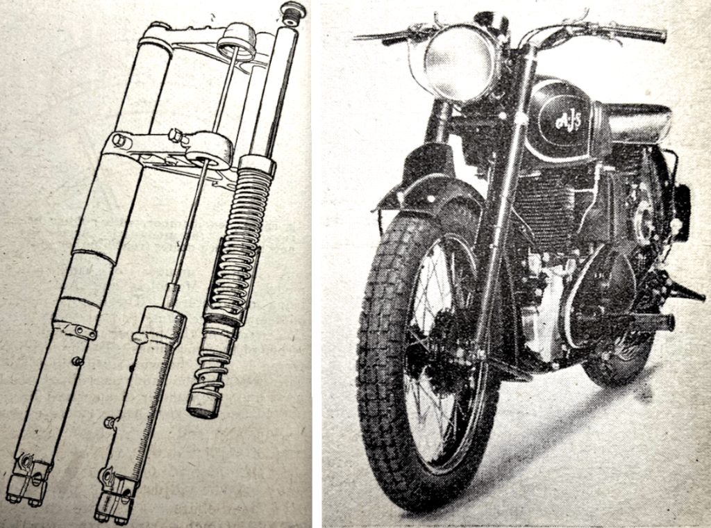 “NUMEROUS IMPROVEMENTS HAVE been made in Matchless and AJS motor cycles. Some of these result from a ‘suggestions’ book which JM (Jock) West, the AMC sales manager, keeps, a book in which are jotted down notes of points that seem to call for improvement. To cite a small example, the oil bath primary chain cases now have a longer screw in the band which holds the halves together. It was found that the rubber sealing washer is liable to expand after use and that as a result, an owner might have trouble in refitting the band. Simple as this change is, it forms a good instance of the attention to detail that is being made a rule at the Associated Motor Cycles factory. Perhaps the most important change for 1947 is in regard to the now famous Teledraulic front forks. These have new springs, so wound as to provide three different rates…The springs afford a soft, easy movement at initial deflection of the forks and offer increasing resistance with increased fork travel. Buffer springs have been incorporated to reduce the