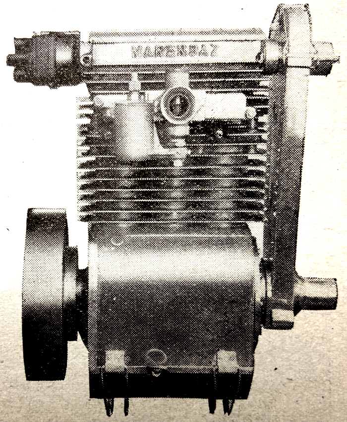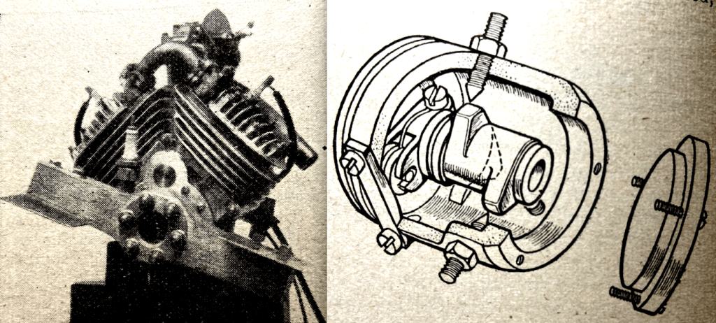 “CAPTAIN DMK MARENDAZ has designed an interesting 650cc three-cylinder engine. The cylinder block and head are in light alloy, with inserted cylinder liners, valve seats, 10mm sparking plug bosses, and holding-down bolt bosses. The valves are vertical and are operated directly by the chain-driven overhead-camshaft. Primarily the engine is designed for use in tractors or for lighting and pumping plants, but it has basic features that appeal to the motor cyclist. In particular I like the three-cylinder-in-line, with its three-throw two-bearing crankshaft.”