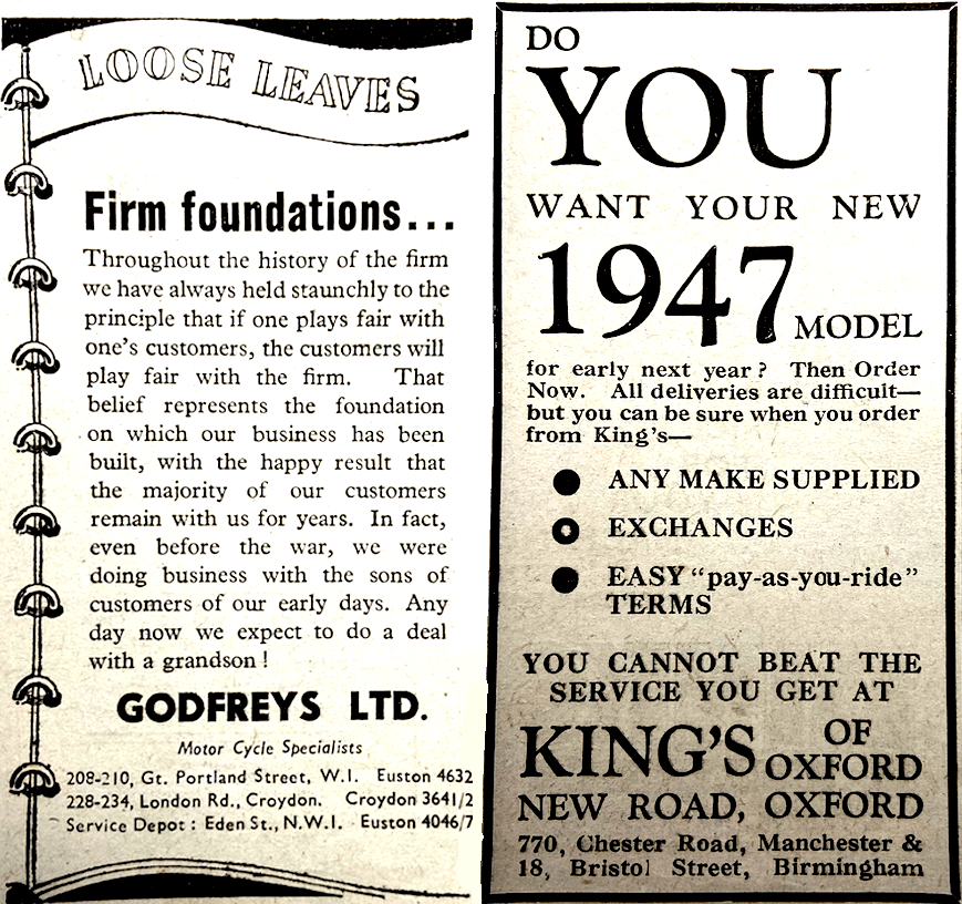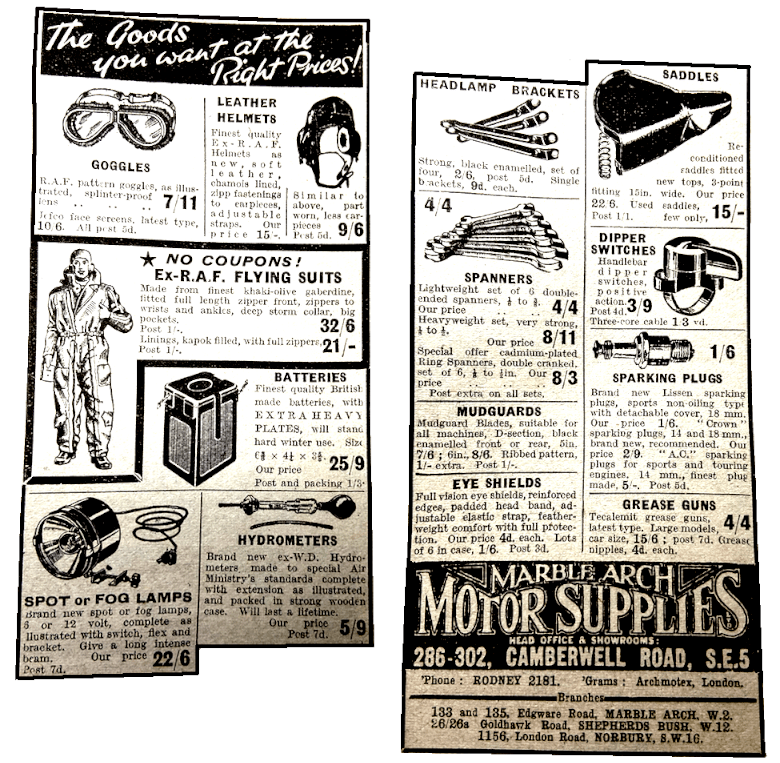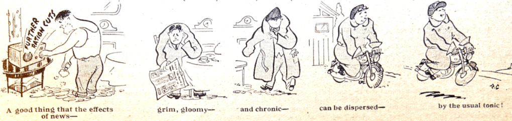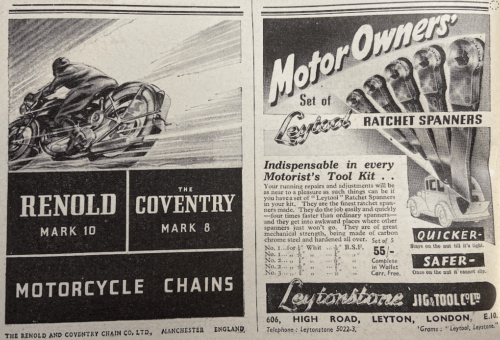 “THE BOARD OF TRADE are to issue ten additional clothing coupons to a wide range of manual workers in industry and agriculture. How about the motor cyclist with his often worn-out riding kit? Isn’t it time he was favoured with a few extra coupons? After all, motor cycles—and motor cycle kit—are necessities to many essential workers in the country.”