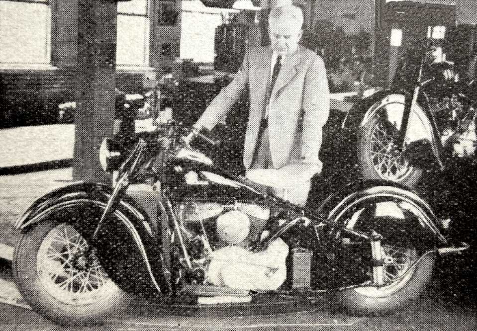 “MORE STREAMLINE, MORE eye appeal and more massive appearance characterise the 1947 Harley-Davidsons. The latest models incorporate many new features, most of which are in the nature of detail improvements. All models are V-twins and the basic engine capacities are 750cc, 1,000cc and 1.200cc. The smallest model, the ’45 Twin’ is a side-valve, the 1,000cc ’61 ohv’ has, of course, an overhead-valve engine, and the largest machine is in two basic types, the ’74 ohv’ and the ’74 Twin’, with respectively over-head and side-valve engines. There are also other models such as the ‘Police’ edition and the ‘Servi-Car’, which are basically similar to the standard types though, of course, the latter is a three-wheeler with the commercial body behind the saddle. Totally enclosed valve gear, large air cleaners, dry sump lubrication and coil ignition, are common to all models. Primary drive is by duplex chain in an oil-bath, and the heavyweight clutch is operated by a pedal on the near side. Gear boxes are the four-speed type with folding kick-starters. Pan-seat saddles with telescopic springing in the seat tube, front and rear crash-bars and deeply valanced mudguards are other details which have been features of Harleys for many years. With the object of ensuring that the gear-change lever when in the top gear position is well clear of the rider’s knee, the gear ratio sequence has been reversed; on the latest models, bottom gear is towards the rider and top farthest away. The new gear-change gate is specially designed to permit swift changes and is chromium plated. On the sides of the tank is a new name plate taking the form of a ball with a convex streamer in chromium plate carrying the words ‘Harley-Davidson’ in red. On the top of the tank is an instrument panel incorporating a large 120mph trip speedometer. The panel has two warning lights, one for the dynamo and one for oil circulation; the words ‘Gen’ and ‘Oil’ are coloured white and fired into red glass. Farther back is the lighting switch. Round the base of the instrument panel is an extruded rubber moulding and the panel is retained by one bolt placed in the middle. The new die-cast zinc-alloy tail lamp merges in with the line of the rear mudguard and carries the holder for the number plate. Improvements in the coil-ignition equipment result in easier adjustment of the contact breaker and the advance-and-retard mechanism. Another feature is the hydraulic damper fitted in front of the springs of the widely famed bottom-link forks. Standard colour schemes for the home market are Flight Red, Skyway Blue and Brilliant Black; for export Olive Green takes the place of Brilliant Black. Though not available to the general public the Police model is particularly interesting. It is the ’61 ohv’ finished in ‘Police Silver’. Additional equipment includes three front lamps (for pursuit purposes), a fire extinguisher and a radio.”