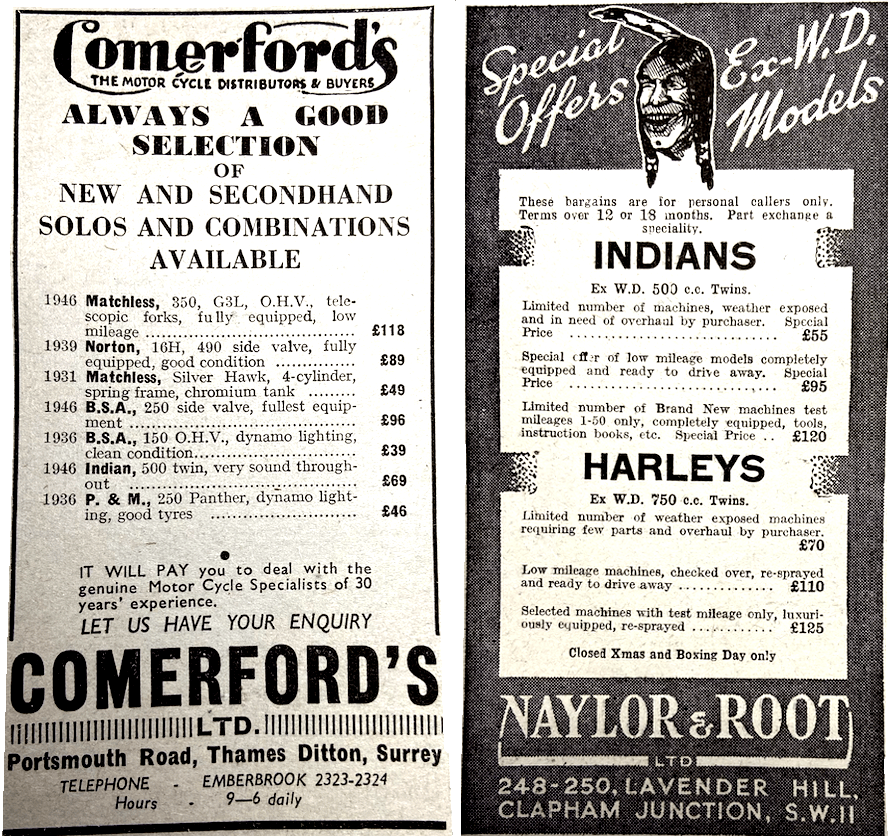 having covered big mileages in his time; the older man who is still under the spell of two wheels; and the shrewd, watchful dealers. Most noticeable of all, perhaps, was a blind man with a white stick. He was with a younger man, possibly his son, and they spoke softly together. What was this model? the blind man asked, and the other told him. The blind man gently praised the machine for its simplicity of design. He felt the wet metal carrier of a sidecar outfit, and ran his fingers over the saddle top. He asked its make. It was an Indian; perhaps the unusually smooth top of the American saddle puzzled him. The windy drizzle never stopped, but still the procession of would-be buyers slowly circulated among the dripping machines, making notes in sodden catalogues. Then the auction was due to begin, and the field was cleared. Damp men, and one or two women, assembled in a large double Nissen hut close by. At eleven o’clock precisely the observant auctioneer rapped sharply on the edge of his rostrum and started the sale. He reminded his audience of the conditions, and that the bidding was in guineas. The first two machines, 250 ohv BSAs, fetched 50 and 55 guineas. A side-valve ‘Lion’ Sunbeam ran up to 75 guineas. The staccato monologue of the auctioneer rarely seemed to cease. ‘A Rudge, gentlemen, anyone start me at 40? Then 30—I have 32½—35—37½—40 over there. Now 42½ over at the back—5—7½…47½, say 50 for it, 50 for it—in the middle at 50—in front here at 52½, 52½, 52½.’ The hammer fell. The buyer came forward to pay his 25% deposit at the table. There were over 300 machines on the list, mostly grey-painted models formerly used by the NFS. Slowly, relentlessly, the machines were sold—modern BSAs, New Imperials, Triumphs, Nortons, Matchlesses, Ajays, Velocettes, Panthers, Ariels, Indians. Though they had stood in the open for several months, the majority, it seemed, were in fair condition—but the buyer, not hearing them running, took his chance. The run of reasonable ohv models fell to the hammer at somewhere between £65 and £75, the less good machines and side-valves often at something round the £55 mark. A Triumph with twisted forks sold for 90 guineas; a springer Norton for 95; a springer Ariel for 87; an Ariel Four, somewhat rusty, for 105 guineas. After a big price a low murmur ran through the crowd. When about 170 machines were sold there came an adjournment for lunch. There was another auctioneer in the afternoon, with an amazingly quick-fire style and with the habit of dropping odd little remarks into the stream of his patter. A woman started to bid, and the auctioneer seized on the fact. At last she bought a BSA for 50 guineas. To an unlucky bidder, he remarked quickly, ‘I hope you get one in a minute.’ Once, in the heat of the fray, he mistook a bid—’Bloke blowing his nose—always dangerous!’ There were a few sidecar outfits under the hammer towards the end. BSAs, Triumphs and Ariels with box sidecars fetched around 85 guineas, but a surprise came when three Indian outfits reached 115, 112½ and 115 guineas apiece. Admittedly, they seemed to have covered only a small mileage. A Norton with the well-known battle-chair’ brought 77½ guineas for HM Government. The sale drew to a close. Outside, the dirty weather of the forenoon had blown itself out, and great golden galleons sailed in the sky. A little procession wended its way across the Missenden fields again. Some indulged in a true British grumble. Prices, they averred, had been. fantastic; it had been a dealer’s day, but how the aforesaid dealers hoped to make a profit after the prices paid was more than the critics could imagine. But others were exultant. After a long exile from the saddle, they owned machines again, and thoughts for the future were twirling in their heads. A few hours in the workshop, and it would be the open road again…Glorious!”