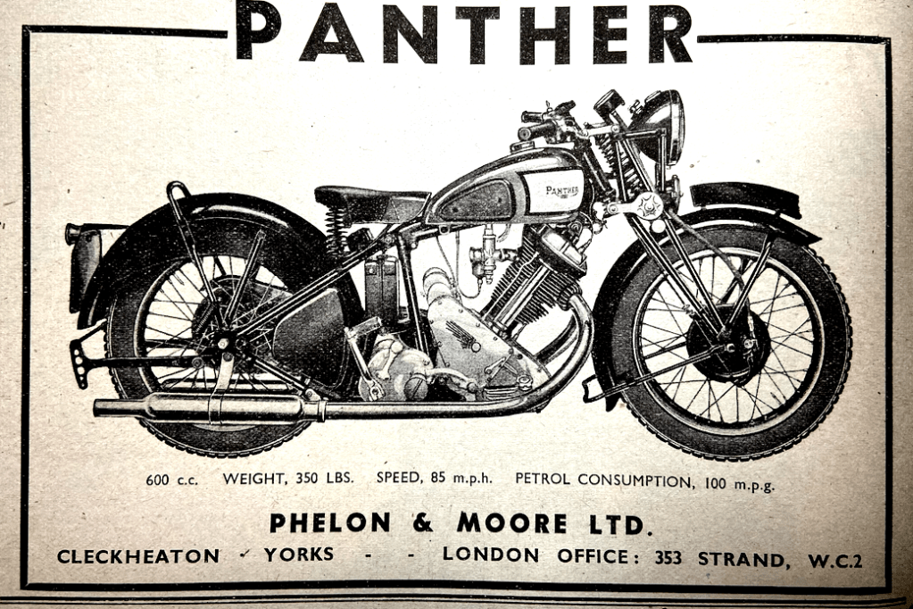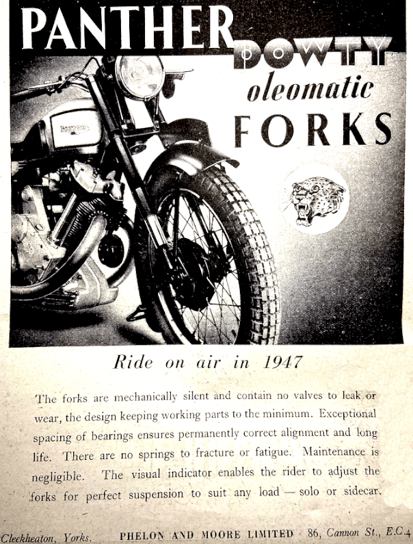 over compression is greatly reduced and the need for raising the exhaust lifter and dropping it at the appropriate moment is overcome. Magneto ignition is employed. The instrument is a Lucas incorporating automatic advance-and-retard. Drive is through the Panther QD coupling. A separate Lucas dynamo, driven by an enclosed duplex chain is employed. Again, the oil is contained in the sump; the capacity is half a gallon…Neoprene synthetic-rubber—almost indestructible—inserts are employed in the clutch of the Burman four-speed gear box…An Enfield rubber-buffer shock absorber is fitted in the rear hub. In the case of this machine there is a polished cast-aluminium oil-bath primary chain ease. The brakes are 8in diameter rear and 7in front, and the tyres 3.25×19. Finish comprises a chromium-plated (3¼-gallon) tank with cream panels lined in gold and fitted with red and chromium nameplates, chromium-plated rims with black centres and red lining, and as regards the remainder of the machine, black. lined in red. Other features are the excellent rolling.type rear stand, cam adjusters for the rear chain, journal wheel bearings, twin Burgess silencers, Terry saddle, integral sidecar and pillion footrest attachments, 11 twin fuel taps and a hinge-type filler cap. The weight is stated to be 385lb and the claimed performance is 85mph solo, 65mph sidecar, 90mpg solo and 60mpg sidecar (many owners will state that. this should be 70-80). The wheel-base is 54in. A most interesting point about this ma. chine is that the Panther-Dowty forks are so designed that in a matter of minutes the fork trail, and therefore the steering of the machine, can be changed from ‘solo’ to ‘sidecar’ or vice-versa…The forks themselves, product of the famous aircraft undercarriage manufacturers and developed with them in co-operation with P&M, differ considerably from any of the telescopic forks that have been described…there are no steel springs…the construction is commendably simple. The suspension medium is air, with oil for damping and for lubrication…the Dowty engineers state that tests have revealed that 20,000 miles can be covered—that this distance has actually been covered—without a pump being applied to the forks. The forks¼, they say, settle about in during the first day, owing, it seems, to the oil absorbing some of the air, and thereafter remain constant…the two legs are balanced, that is, the air chambers, one in each leg, are linked together by a pipe which runs in the U of the top cross-member…A short run on the Model 70 fitted with the forks showed that the Panther-Dowty front forks provide an unusually high degree of comfort.” Prices (inc purchase tax): Model 60, £107 19s; Model 70, £117 9s 6d; Model 100, £163 10s 3d; speedo, £5 1s 8d.