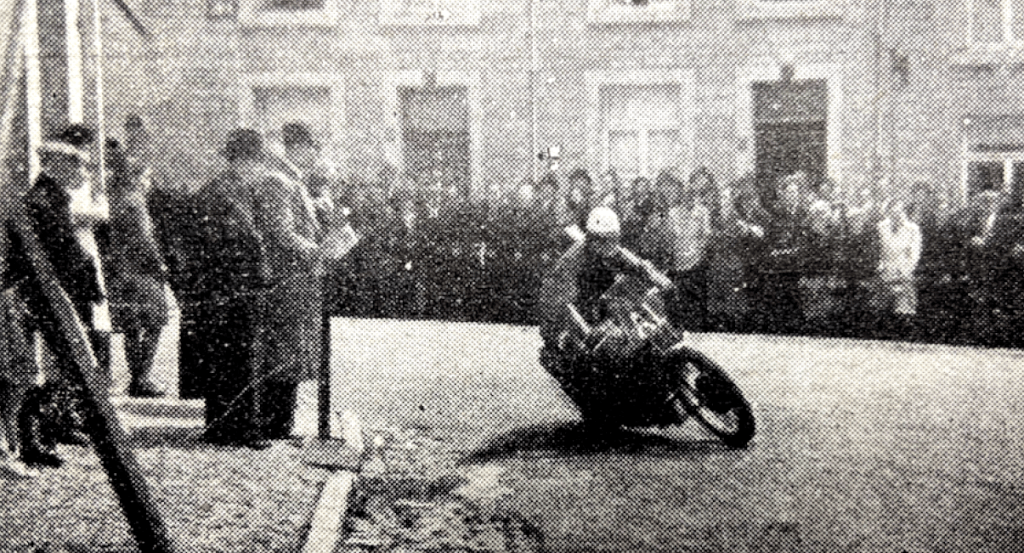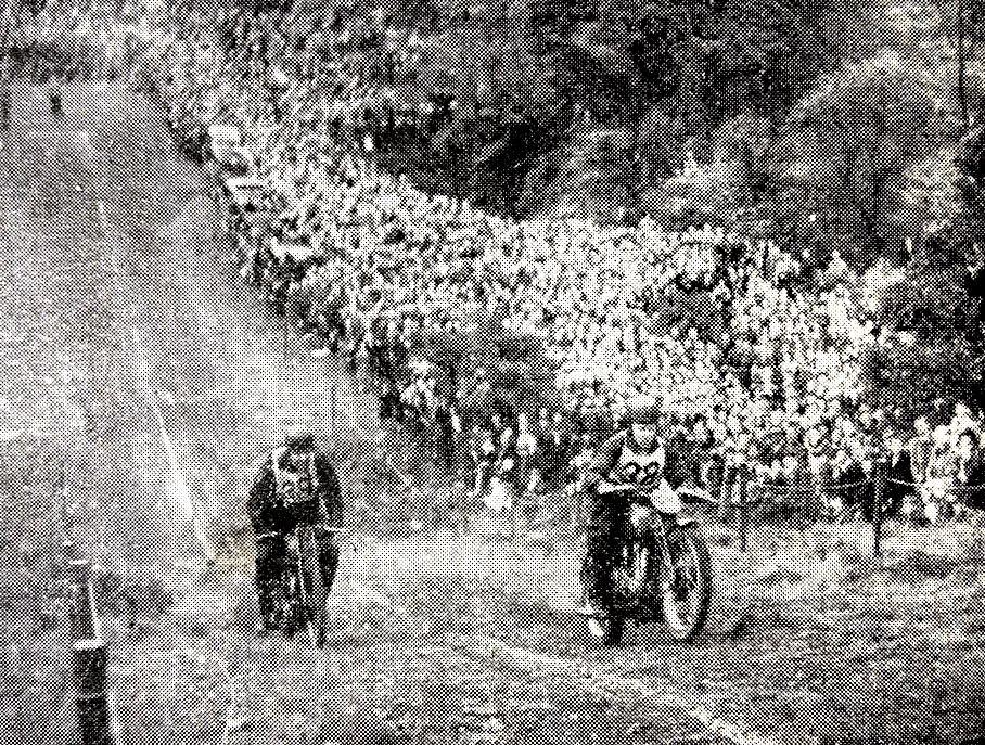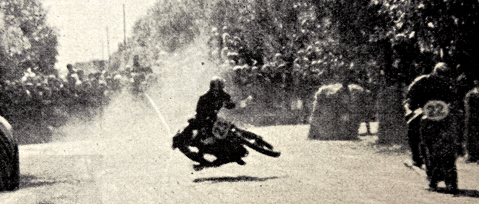 winner of the larger class and who also won the Governor’s Trophy for best performance on handicap. In the 250cc class, LC Martin, from the Isle of Man, repeated his 1939 win in this class. Crowds of spectators lined the course well before the start at 3pm. At mid-day there was a slight shower of rain though not enough to make the roads wet. Nevertheless, billowing clouds moved malevolently across the sky, blotting out the sun and promising rain for the race. By 2pm the sun peeped between the clouds occasionally and raised hopes that the threatened wetness would keep away. Keep away it did, and by late afternoon, when all racing was finished, the sun shone from a clear sky. After the Governor, HE the Earl of Granville, had chatted to riders, the hushed tenseness could almost be felt as the minutes ticked towards 3pm—a hush interrupted only by riders as they made certain bottom gears were engaged and carburettors were flooded. Zoom went the maroon and, after a short patter of boots, the 500s screamed away. One minute later, the 350cc class pushed off, and, after a further minute, the 250s started. As the sound of the last machine died in the distance, a flag-draped Norton, No 50, ‘entered’ by the Ulster MCC, was wheeled slowly past the start in memory of notable motor cyclists who had died on war service. THE 500cc RACE: 13 riders faced the starter, with R McCandless (Triumph), AJ Bell (Norton) and RT Hill. (BSA) in the front row. Hill’s engine fired instantly, and he shot away about two yards ahead of Bell and RLGraham (Norton). The rest went off in a screaming bunch, except J Hayes, who had to push some 50 yards before his Rudge finally got going. Within five minutes came news that RL Graham led from Bell. But at the end of the lap, Bell, riding to expected form, had passed Graham and was a couple of yards ahead. Bell’s time for the standing start lap was 11min 30sec (86.13mph), which promised well, and Graham was announced as