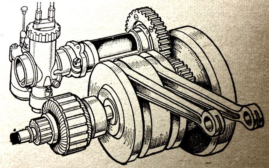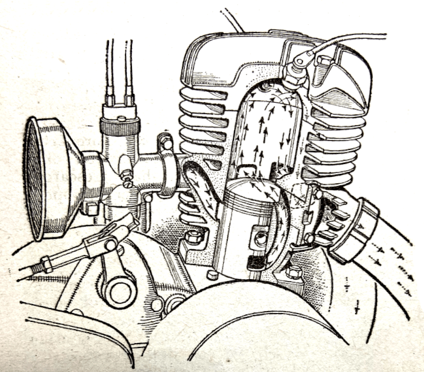Mission reports: ‘In general, we should judge that the “average” German motor cycle was of a rather cleaner and more pleasing appearance than the average British motor cycle, although some rather striking improvements have now been made in our own industry.’ It perceives the work of artists in the general lines of German machines. • • • The Schnürle patent refers to “transfer passages opening into the cylinder at both ends of the exhaust ports, and at about the same height, in such a manner that the mixture rises up the side of the cylinder opposite the exhaust ports, the transfer passages at their entrance into the cylinder being directed obliquely upwards…The mixtures currently meet at the cylinder wall and rise up together. • • • Commenting on the 250cc two-piston Triumph two-stroke, the Mission remarks: “In view of the poor balance, due to two long and heavy pistons and large-diameter gudgeon-pins, the complication hardly seems justified.” A speed of approximately 60mph with the rider sitting up is quoted. • • • Zündapps, in 1936, decided to make a 1,000cc four with a Roots-type blower for an attempt on the world’s maximum speed record. Parts were made, but the engine never assembled. Dr. Popp says, “If possible, work on this motor will be picked up again.” • • • Bosch had a very small selenium rectifier for their 25-watt flywheel magneto which fitted in the head lamp. • • • The German export -bounty system
