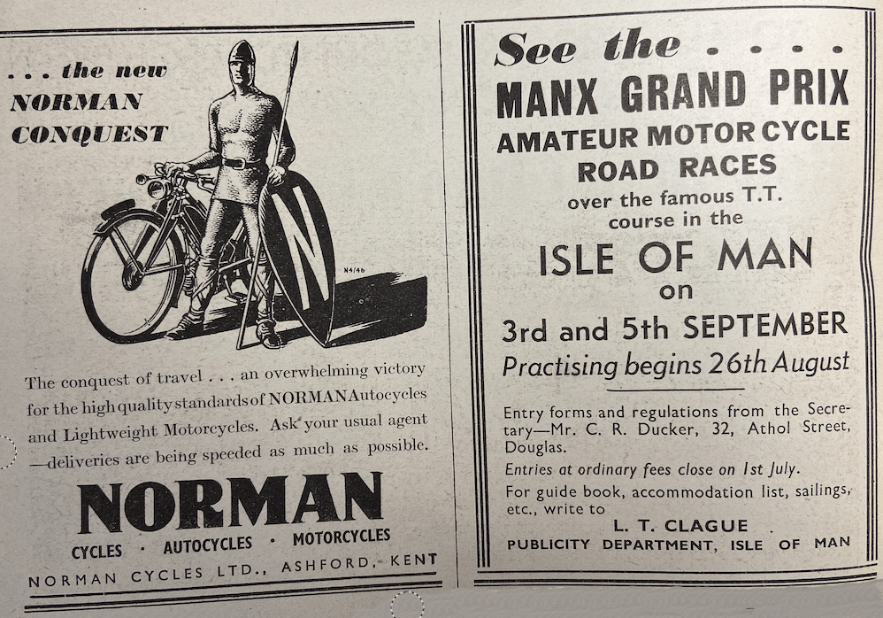 “NEXT MONDAY AT 5.45 in the morning the curtain lifts for one of the biggest series of road races ever held. The event, of course, is the Manx Grand Prix, the first post-war Isle of Man races, with its record total of 187 entries. The practising over the famous 37¾-mile Mountain circuit in the Isle of Man will be held from August 26th to September 2nd between 5.45 and 7.30am except on Sunday, September 1st, when there will be no practice period, and next Thursday, August 29th, when the practising will be in the afternoon, from 2.30 to 4.30. We are glad of this last innovation. For several years immediately pre-war there was afternoon practising for the Tourist Trophy Races, and it is only right that those in the ‘non-professional’ Isle of Man event should have the benefit of trying their machines at a period of the day when riding and atmospheric conditions are likely to be akin to those during the hours when the races are run. For the Senior, the 500cc race, which is to be run on Thursday, September 5th, there is the magnificent entry of 84 competitors. For the Lightweight (250cc) and Junior (350cc), which are to be held concurrently on Tuesday, September 3rd, there are respectively 40 and 63. Happily, the Isle of Man authorities have succeeded in overcoming the difficulty over the supply of fuel, but the petrol will only be standard ‘pool’, and, what will also reduce average speeds in the races, competitors will have to refuel from two-gallon tins. Is it not possible even at this late date to arrange for ‘Jerricans’, of which there must be thousands lying by in WD stores?”
